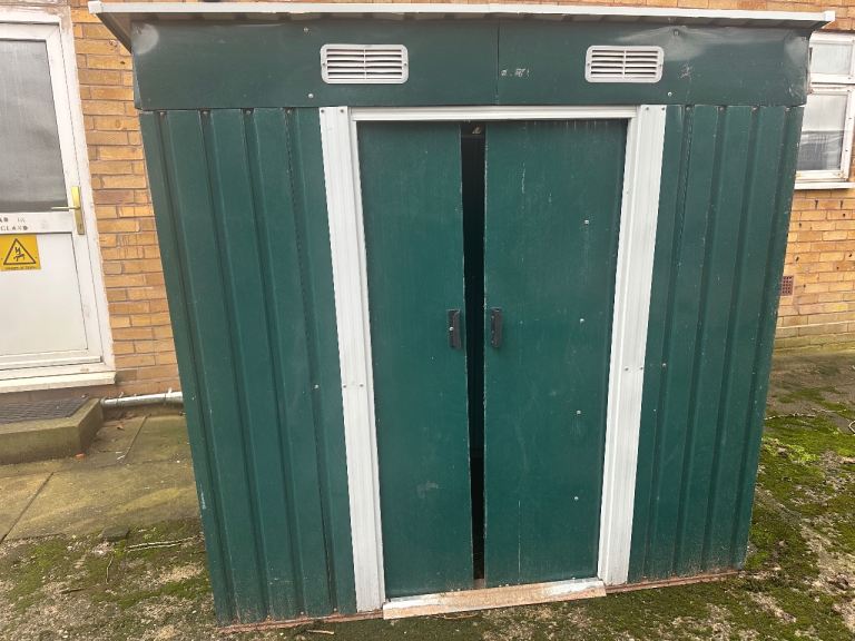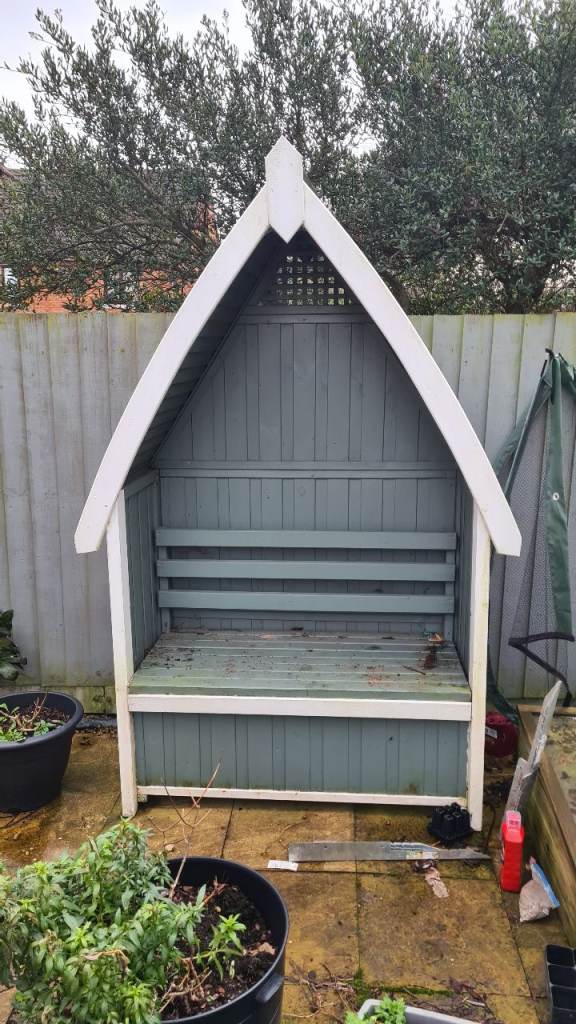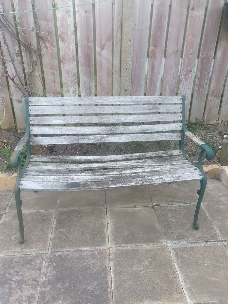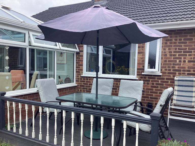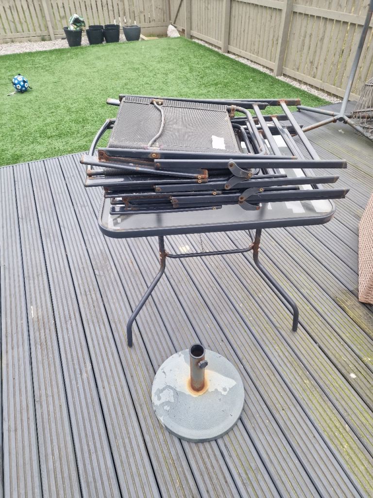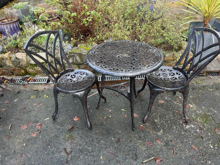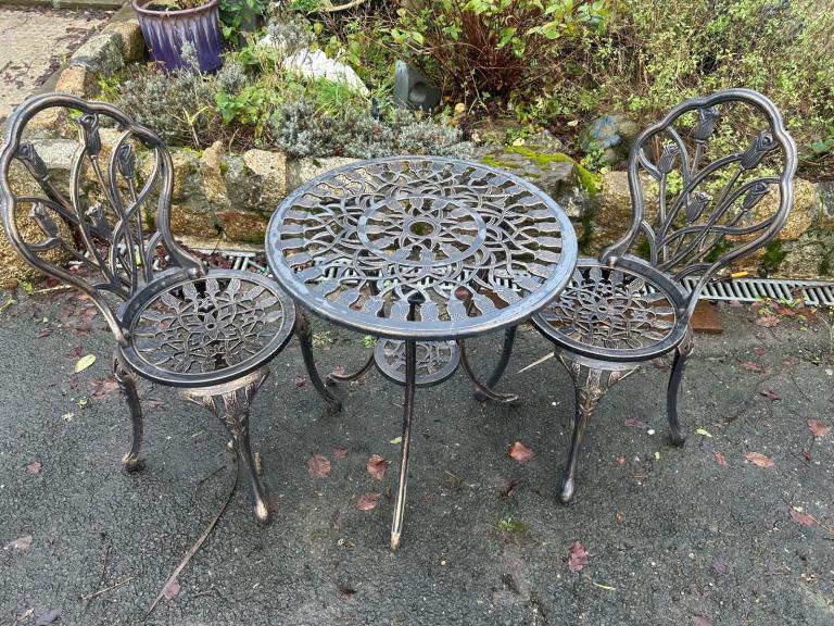 A white metal garden table. It has a strong glass top heavy enough for garden pots.