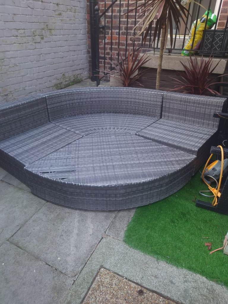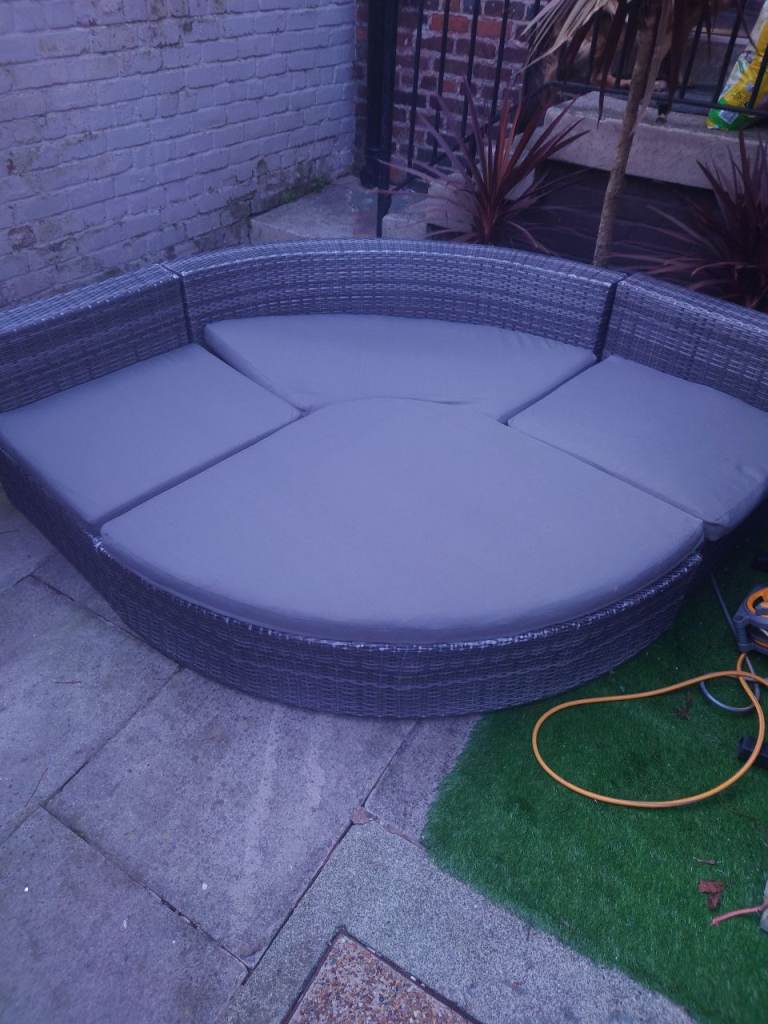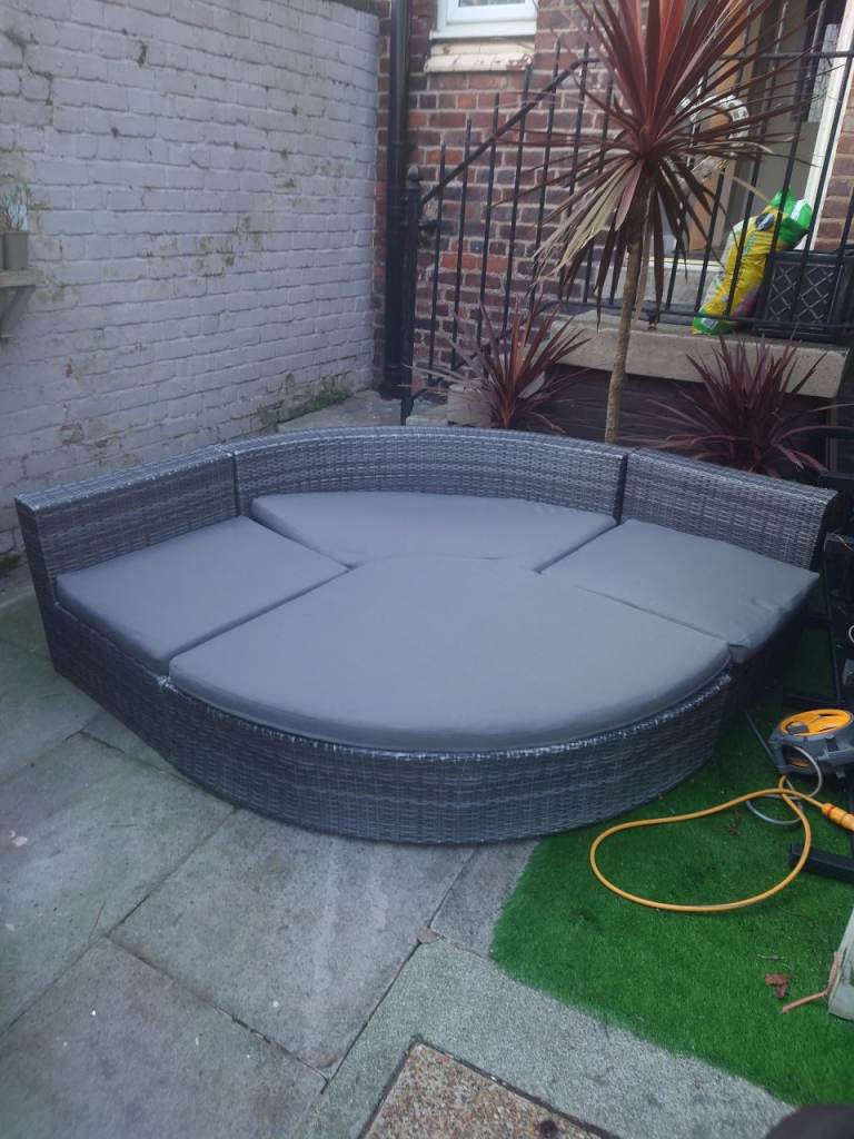 Used but still in good condition, a little bit of damage to the front of the curved area but isn't a problem, one of the zips is faulty easily repairable. No back cushions.