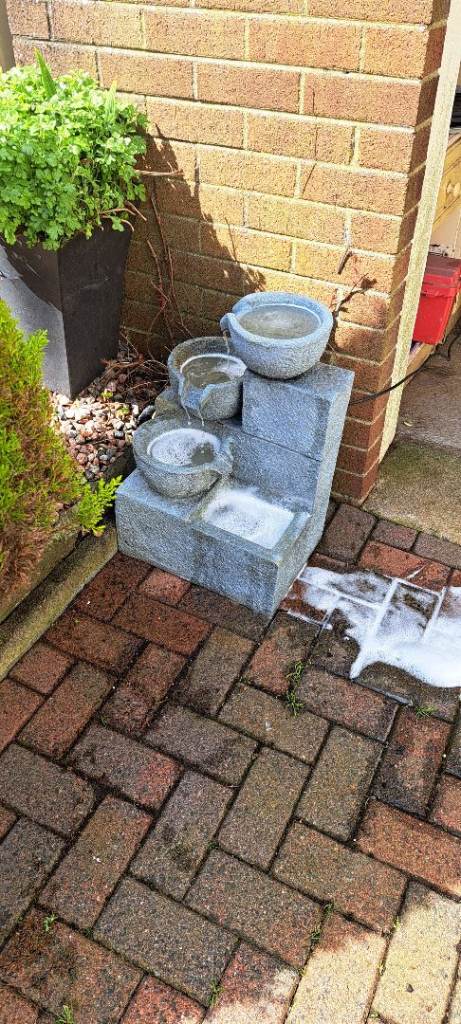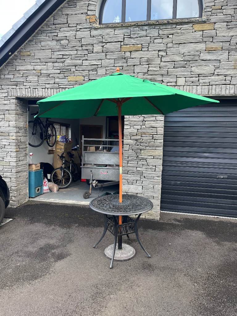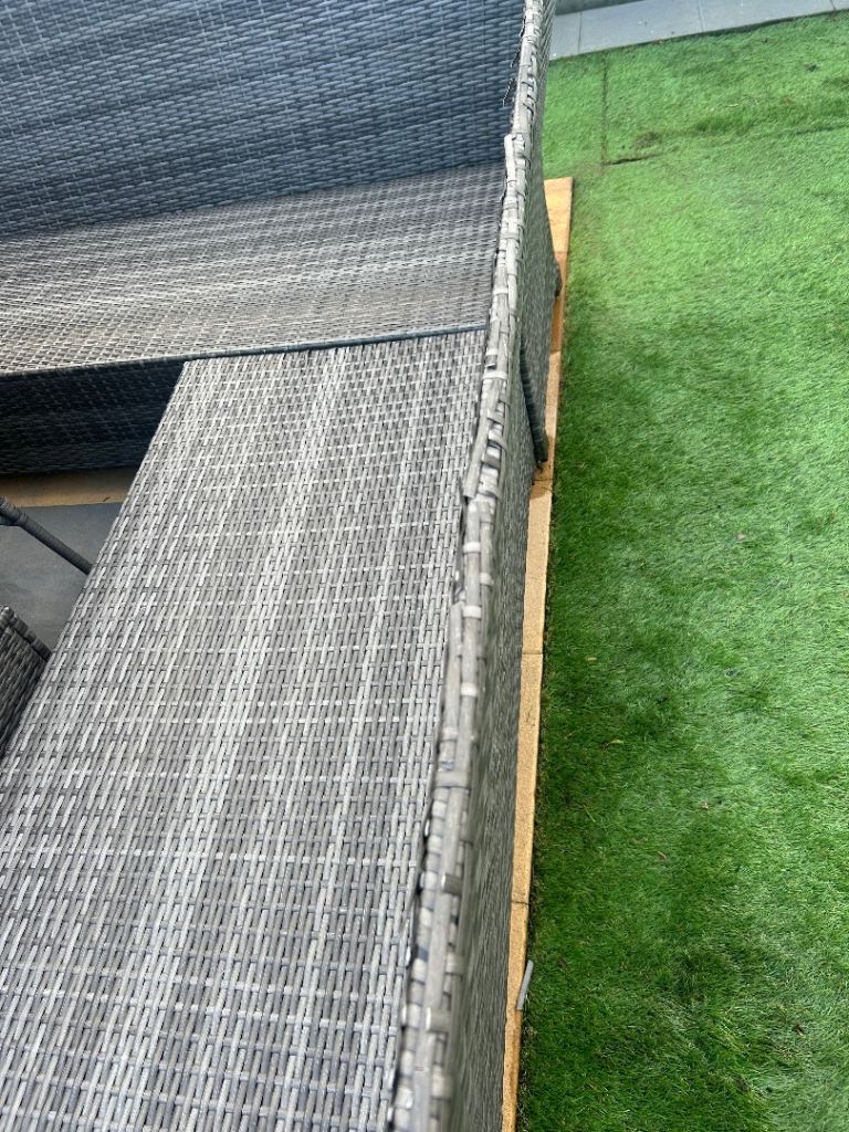 Good condition - please see pictures of areas for repair. Weather proof frame. Large corner sofa with 3 footstools. Dark grey frame with lighter grey cushions. Glass top matching table. Two blue cushions included. Table approx. L140cm W80cm H70cm. Sofa approx. L240cm D180cm. No disassembly. (Corner unit can be split in two).