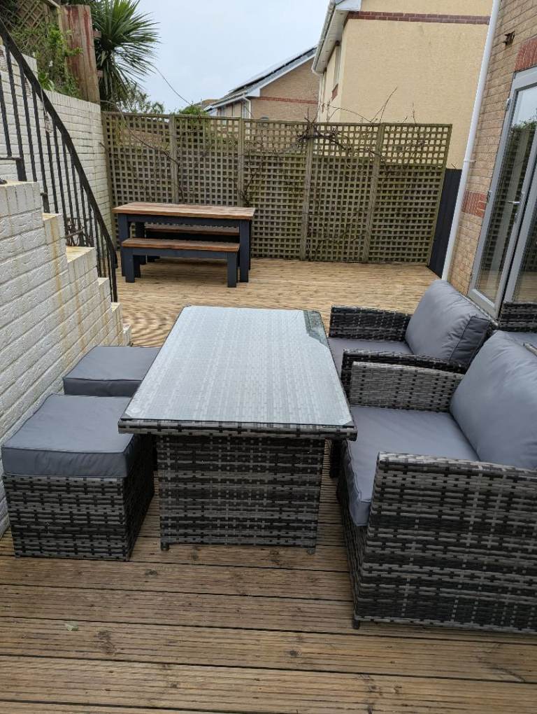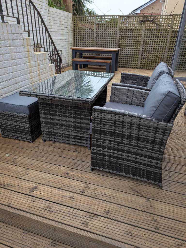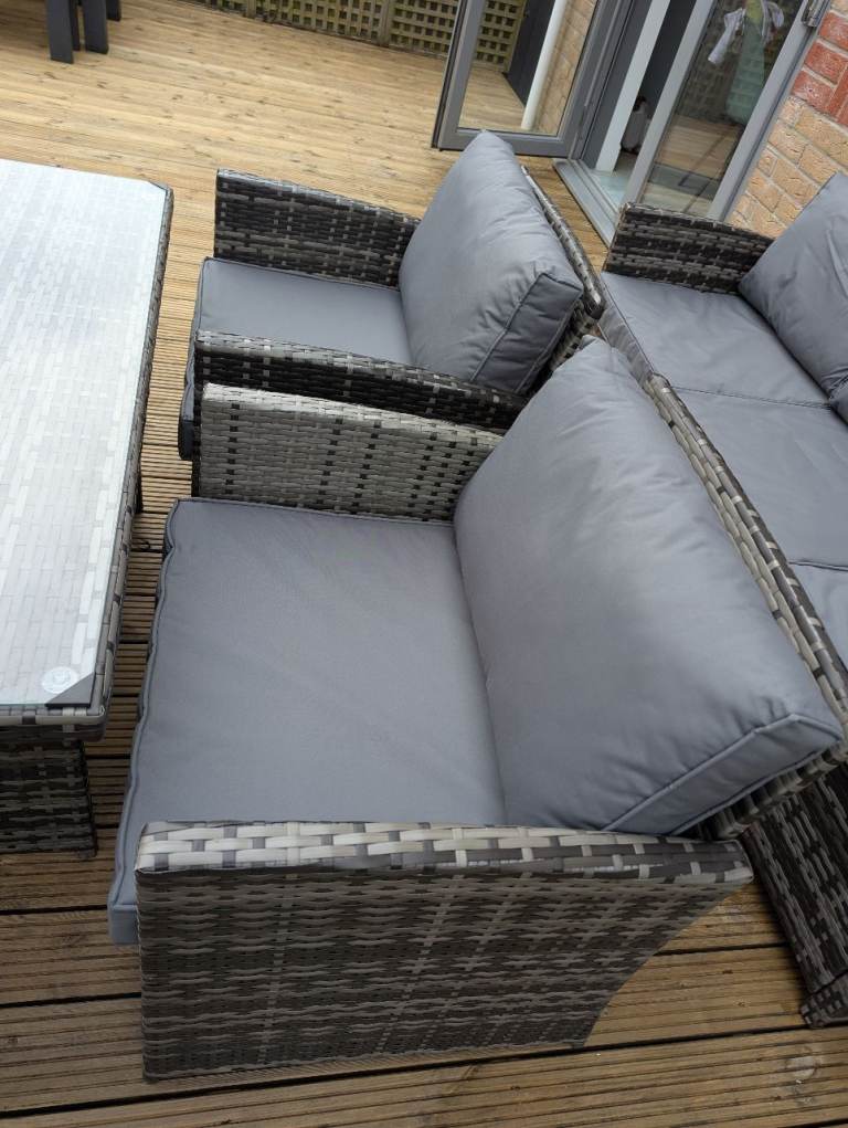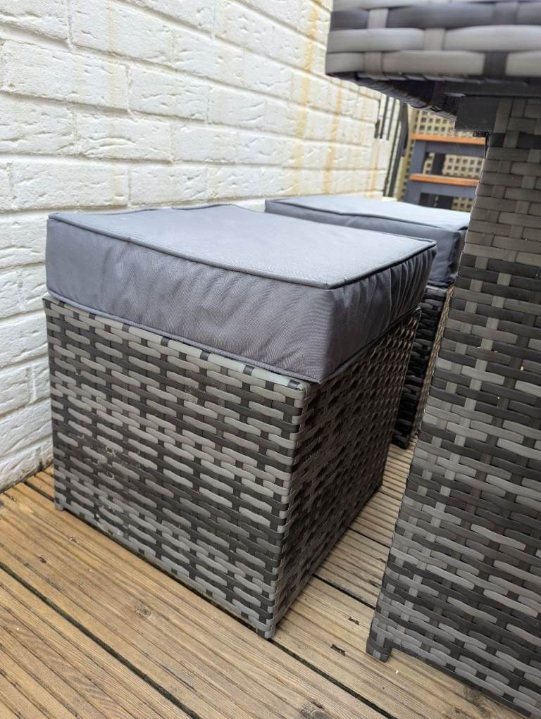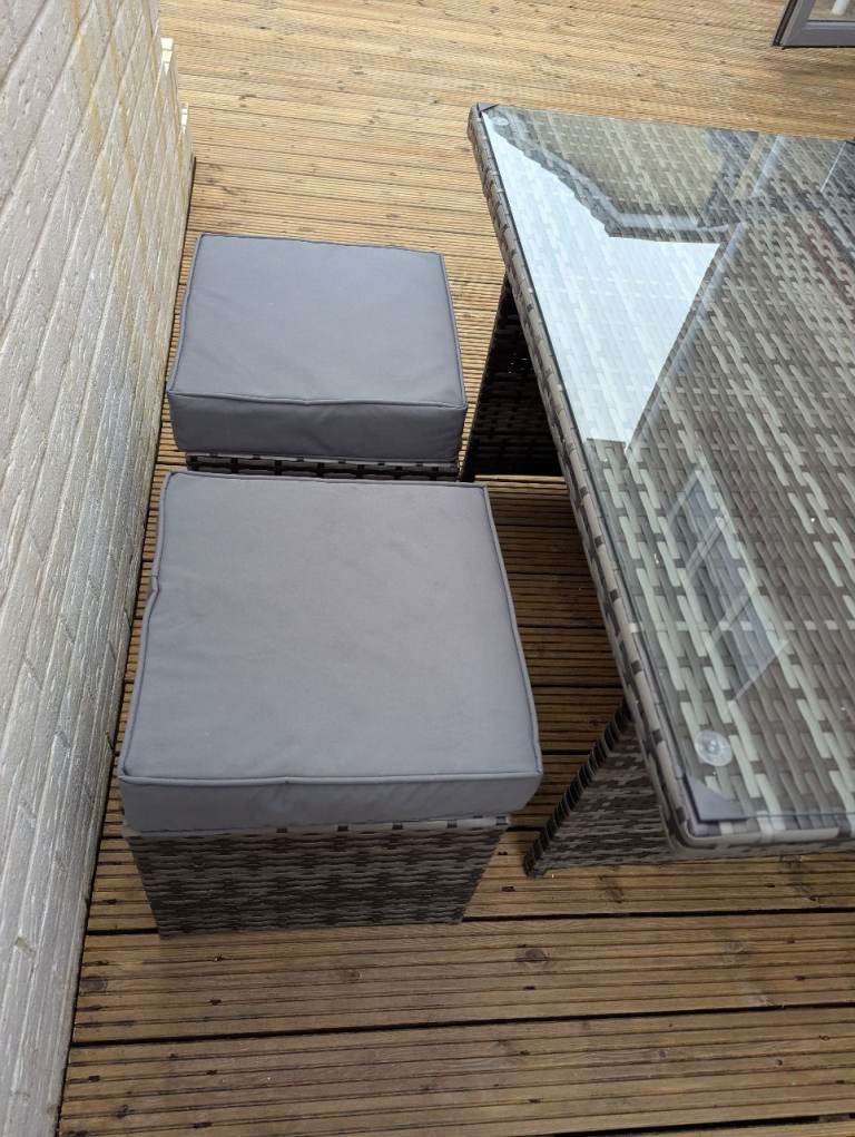 Two stools, two chairs and a glass topped table. All cushions. £250. If you want the sofa too I'll do the whole lot for 400.