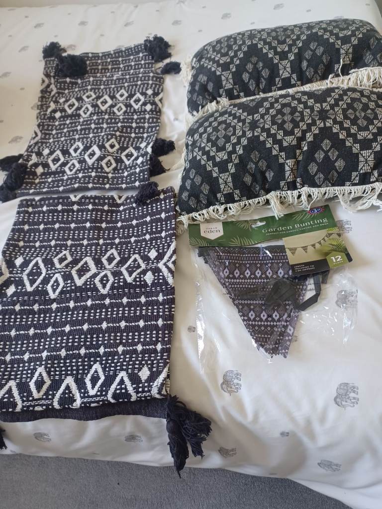 Two cushions, table runner, four place mats and bunting. All matching and in great condition. Fixed price and collection from G75 8NN.