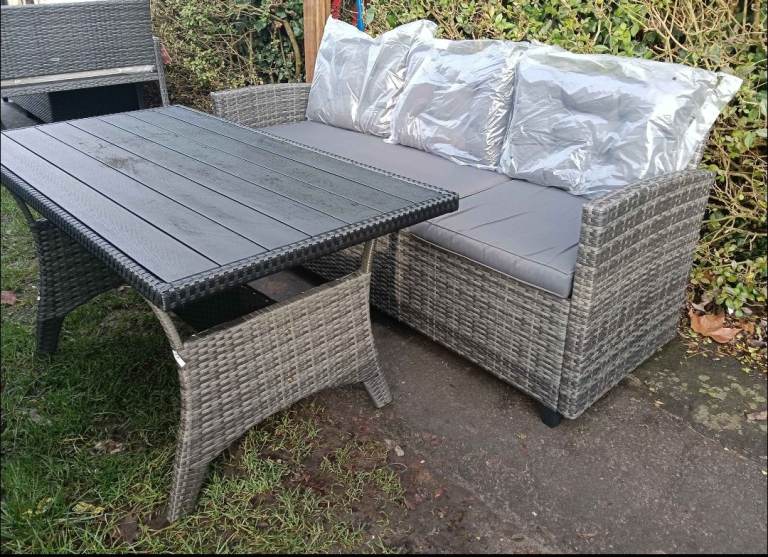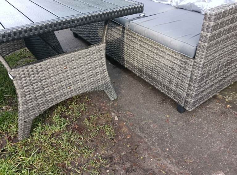 Rattan 3 seater sofa with grey cushions