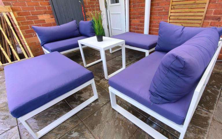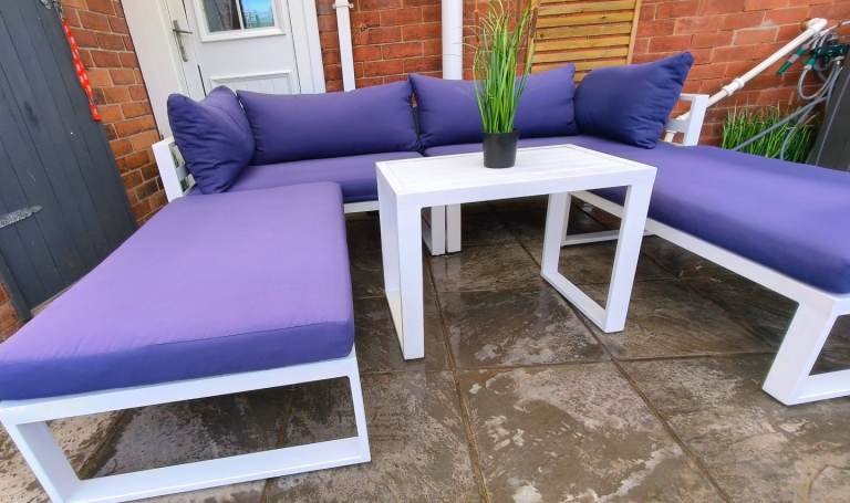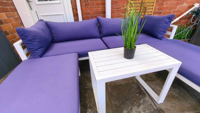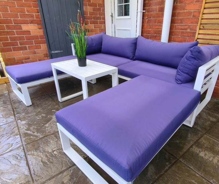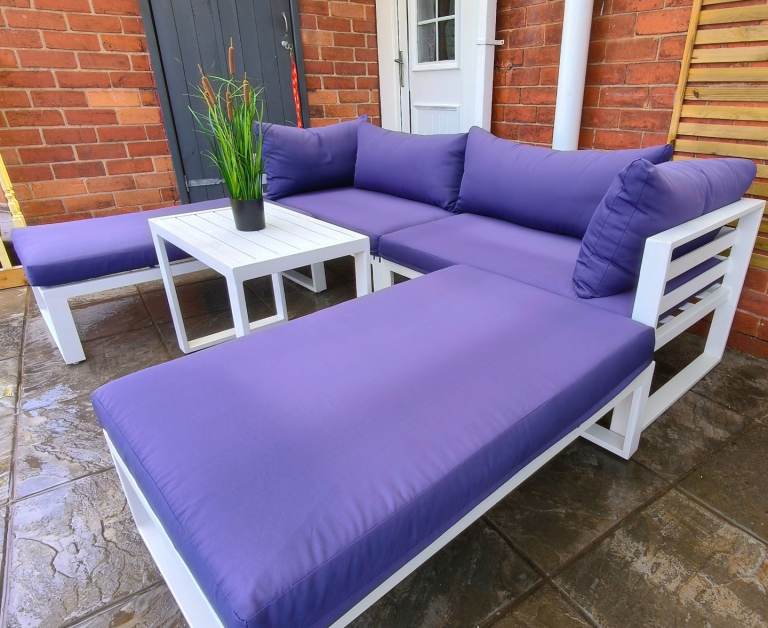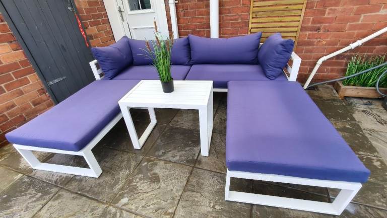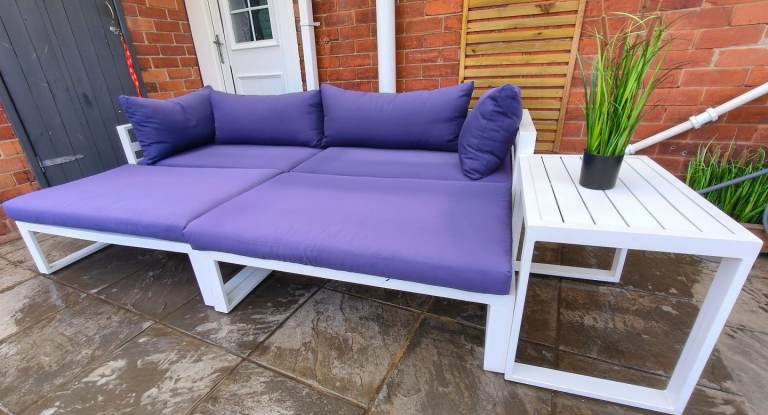 For sale beautiful white aluminium santorini lounge set with side cushions in purple . For measurements see last pic. A lot of configuration available see pics. Really great condition a lot of life left in it all covers come off for wash. Van required for collection anyway can help with that if required. No time wasters pls. First come first serve basis ONLY.