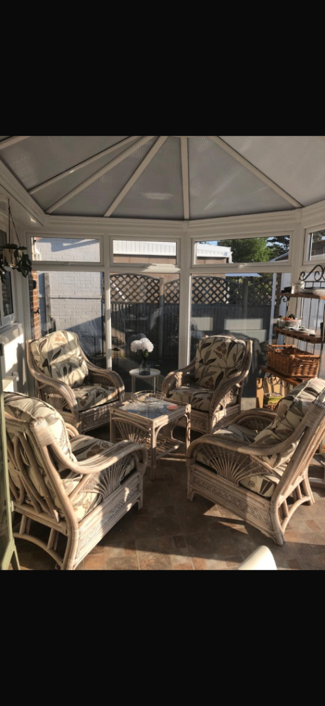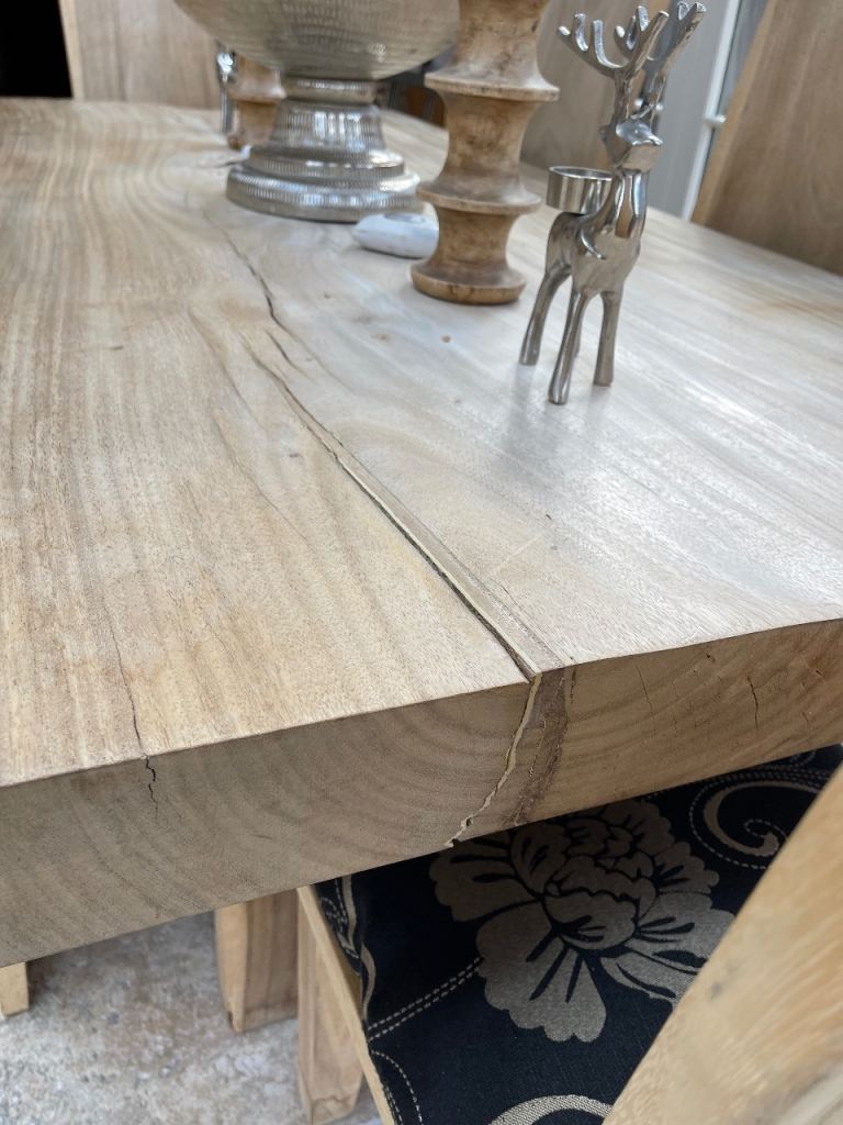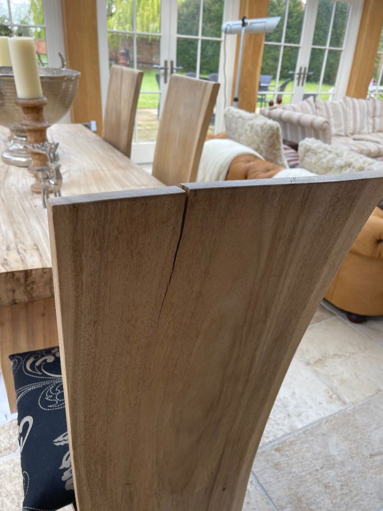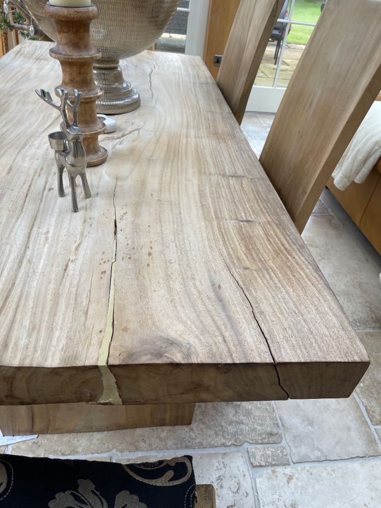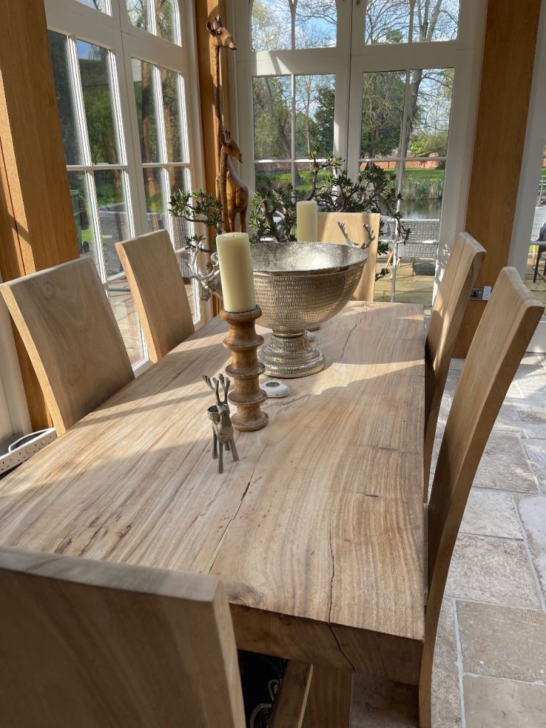 This is a beautiful heavy wooden outdoor table and chairs. It was originally kept inside when these photos were taken, but has been outside for the past year or so and therefore needs some sanding and TLC. Recommend viewing. Some natural splits in the table as shown, and to a couple of the chairs, but this simply adds character. The table measures 200 cm x 90 cm and the top is 9 cm thick. The chairs currently retail at £130 each and the RRP for the table is £1200. From a pet free non smoking home