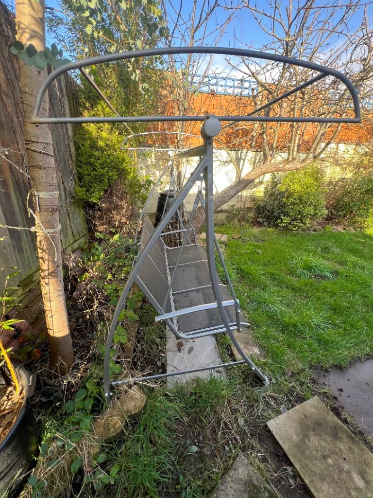 Sturdy Three seater garden swing with waterproof mesh seats. Just needs a new canopy (Amazon) the winter storms wrecked the last one.