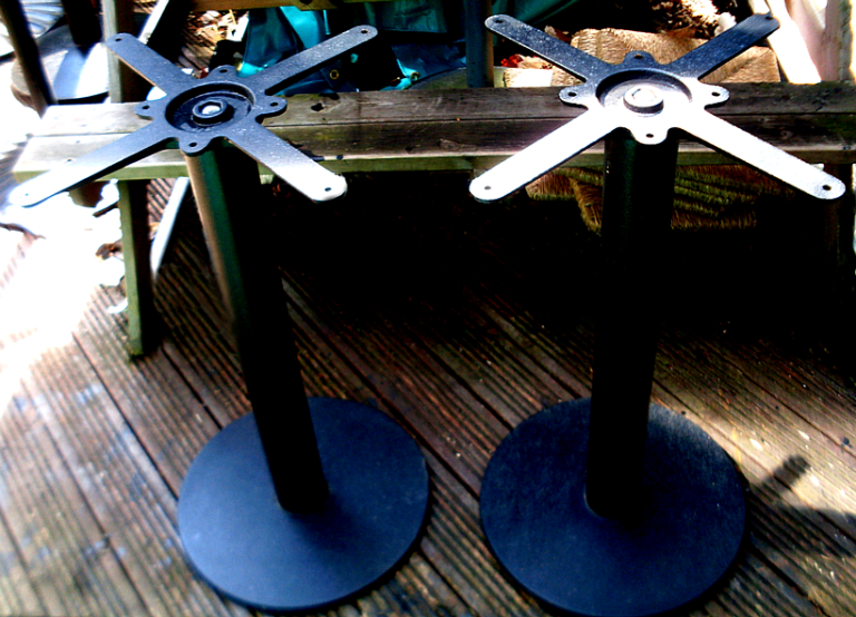 EXCELLENT CONDITION, HEAVY BASES and STYLISH NON-ROTTABLE SYNTHETIC WOODEN TOPS: - READY TO USE HEAVY & STURDY CAST IRON PUB TABLE BASES: - £80 each, but only £75 each when buying four of more, or just £70 each when buying eight or more. Tops 60cm in diameter, they will LAST FOREVER. Ring us on Θ345 163 2177 to reserve and arrange a visit. Most tops are BRAND NEW items.