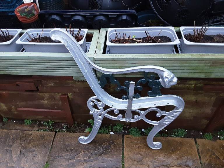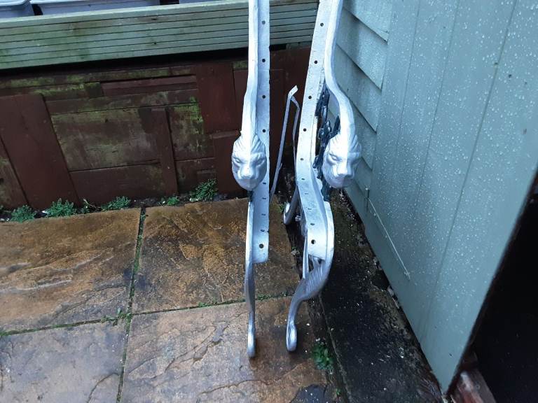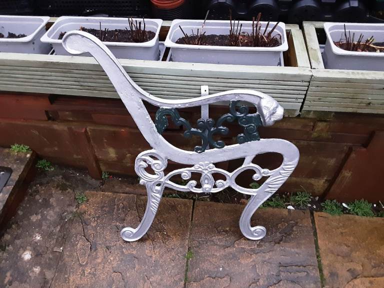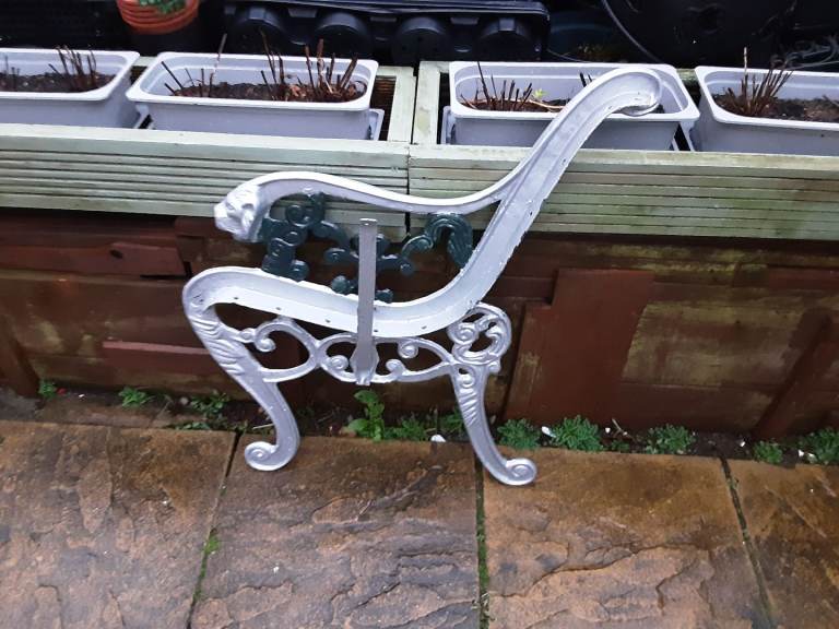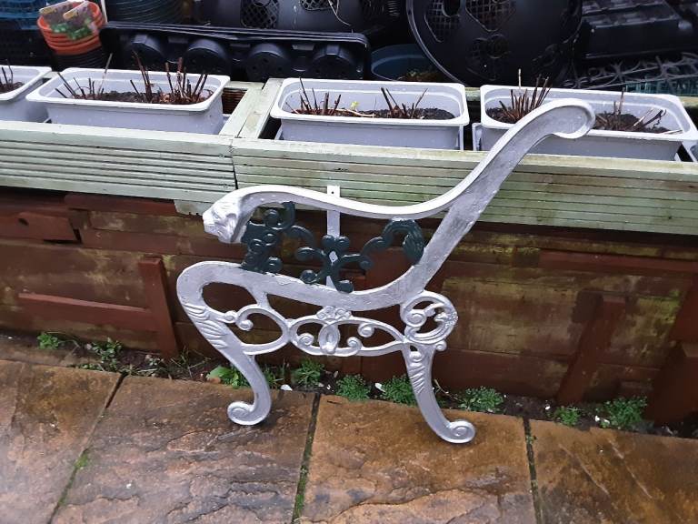 Pair of wrought iron seat ends. Old but in solid condition. Overall height 74cms. Nice design. These are very heavy. Painted with silver and green hammerite. See photos for condition. When restored will make a lovely bench. Cash on collection only please. Any questions please ask.