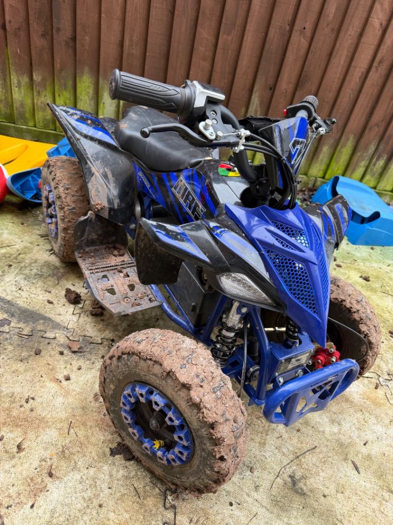 Kids quad bike for sale 36v comes with a charger and two keys has 3 speed settings has recently had a new rear tyre also got a brand new front tyre to go with it as a spare new rear brake pads perfectly good working order good for a kid to start off on my boy did now out grown it ages from 3/6 depending on how tall battery last on full speed about a hour has lights horn on/off ignition also has forward and reverse setting does about 25mph bit muddy as haven’t had time to clean off the mud looking for 200 Ono if still posted (ITS STILL AVAILABLE)