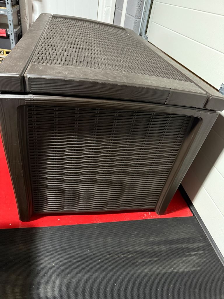 EXCELLENT CONDITION Keter Borneo 416L Outdoor 60% recycled Garden Furniture Storage Box Brown Rattan Effect | Fade Free | All Weather Resistant | Safe and Secure | Zero Maintenance