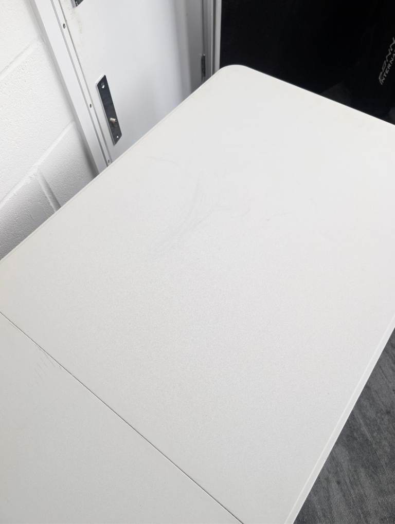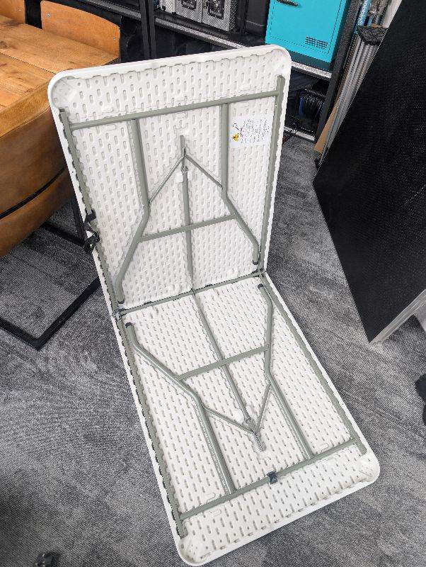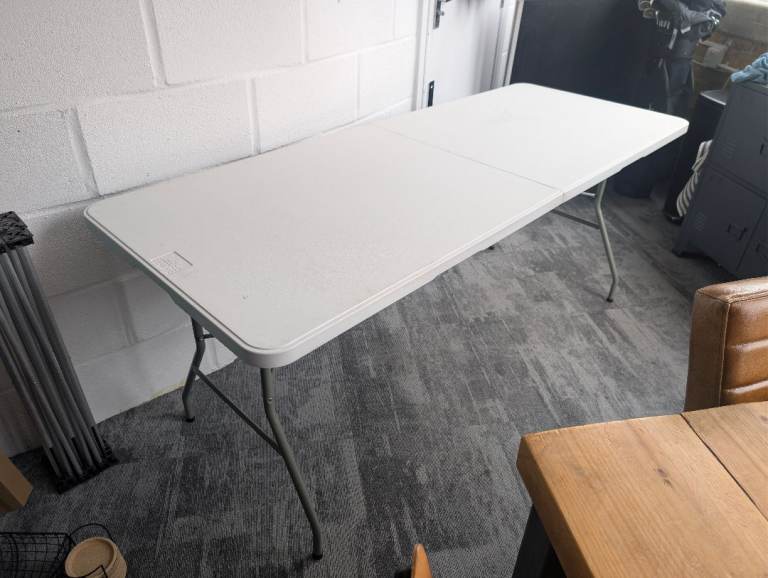 Sturdy plastic folding table is strong and stable when in use, but also folds down into a compact shape making it easy to transport and store. It comes in a white table top colour as shown in the image.