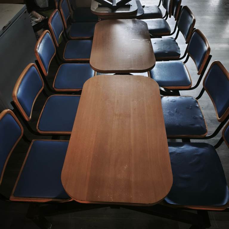 There are 4 cafe-style tables in good condition. Each is 120, but if all 4 are purchased together, the price can be reduced to 400.