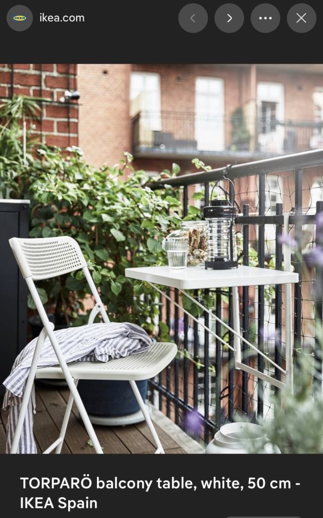 IKEA table that mounts to balcony railings. No drilling or heavy artillery required as it affixes using adjustable clamps. Incredibly space-saving but still somehow feels big enough.
