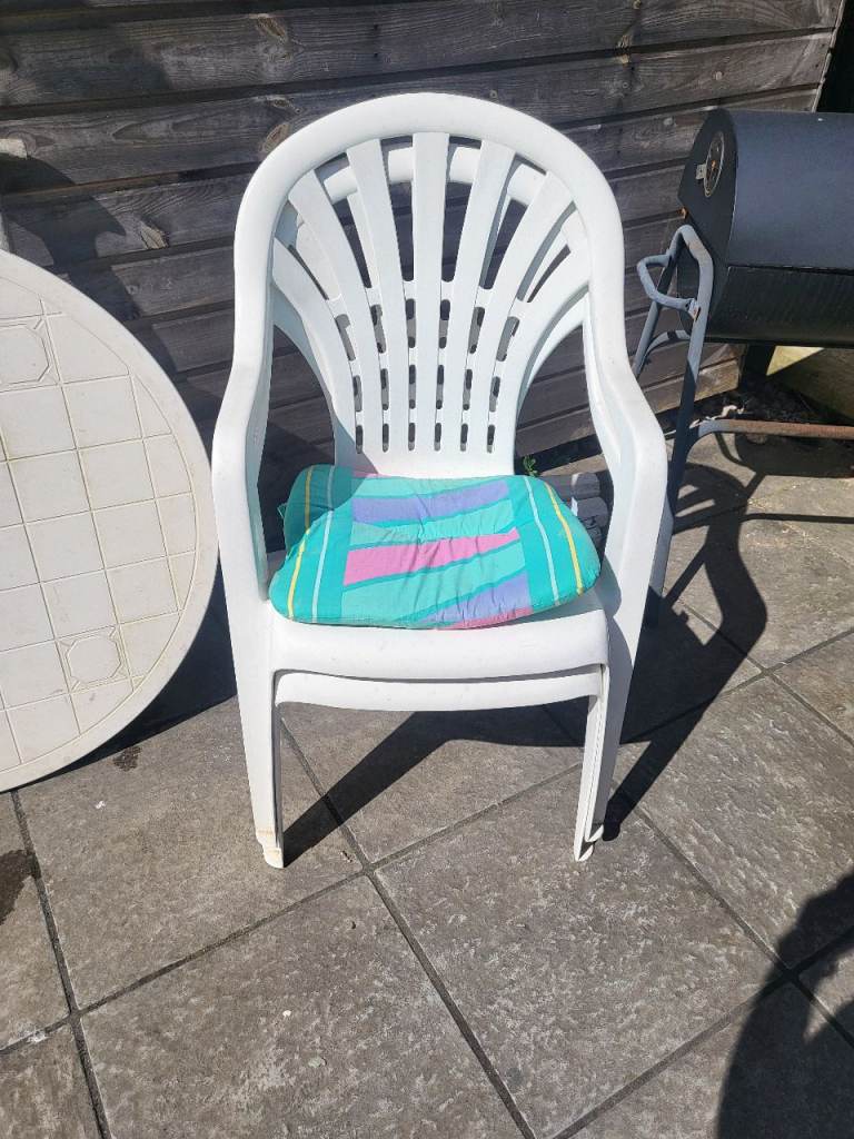 White plastic out door table and 6 chairs with cushions