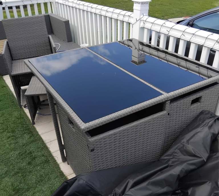 Dark brown Polyrattan outdoor garden table with covered ice bucket holder.