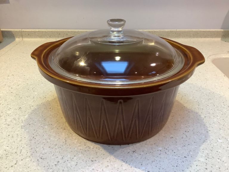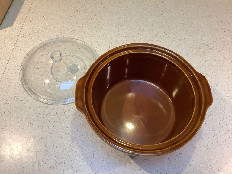 Consists of double handled heater case, inside is a removable double handled stoneware pot with glass lid.