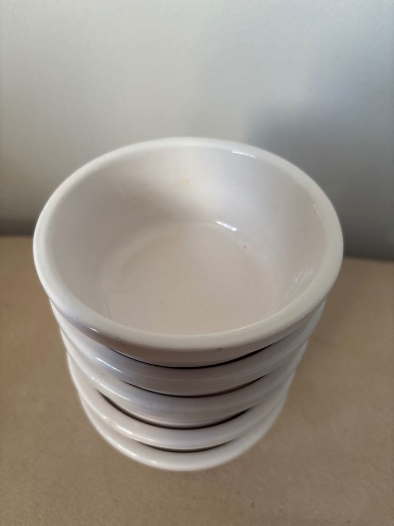 A set of five white ovenware dishes for individual pies etc. Also ideal party snack dishes etc. Just £2 for all of them