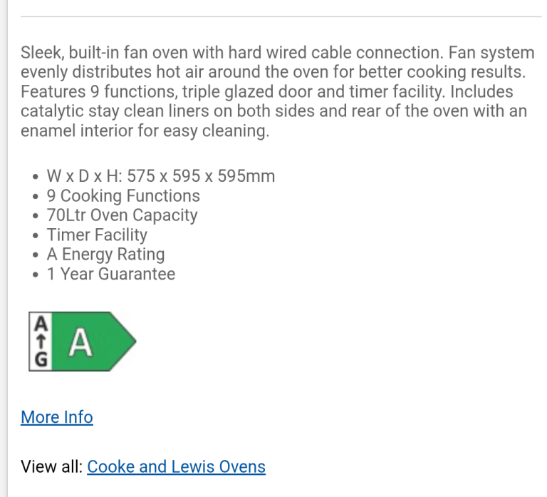 Sleek, built-in fan oven with hard wired cable connection. Fan system evenly distributes hot air around the oven for better cooking results. Features 9 functions, triple glazed door and timer facility. Includes catalytic stay clean liners on both sides and rear of the oven with an enamel interior for easy cleaning.