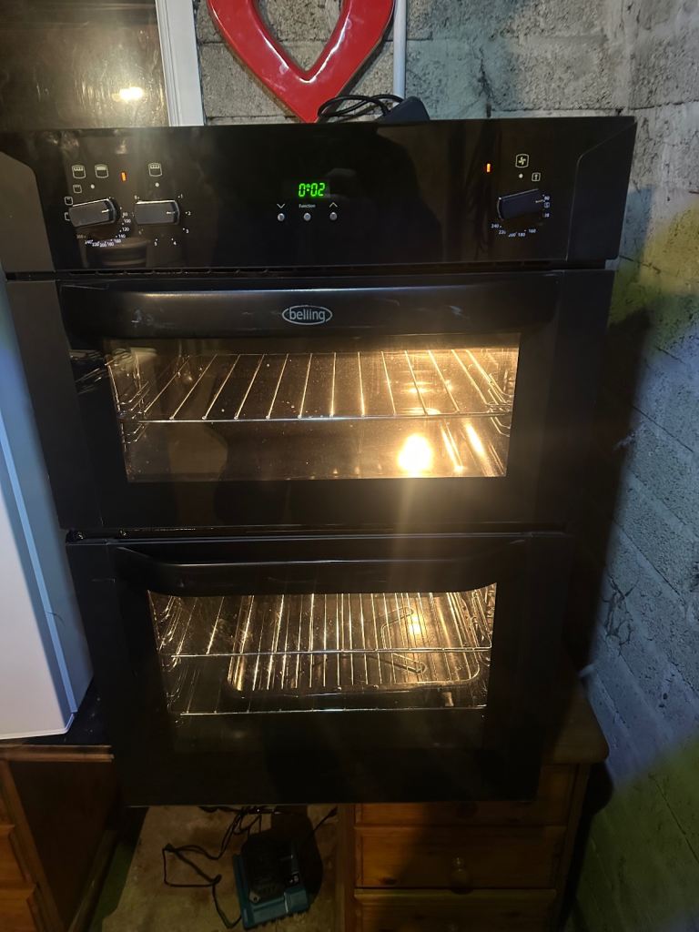 Integrated/built-in double oven, brand is Hotpoint. Dimensions: 58cm outer width (55cm inner width), 85cm high, 56cm deep. Colour is black and silver. Price is negotiable.