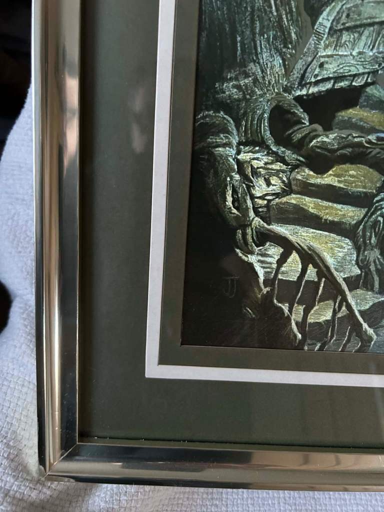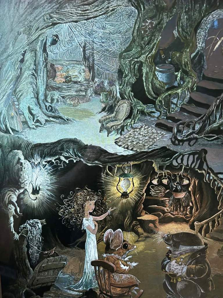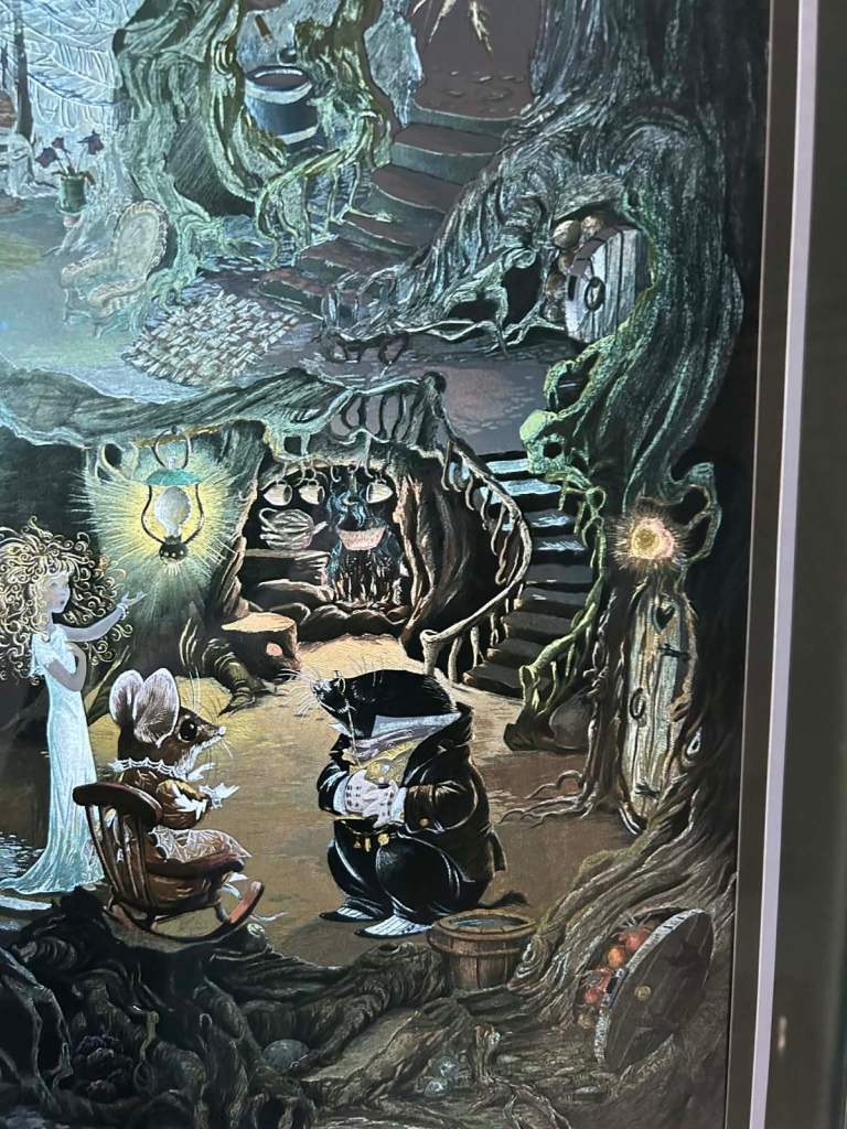 Relive your childhood or pass on the excitement of Hans Christian Anderson to the next generation. Produced in 1980 this whimsical fantasy world has been re created in intricate detail using Dufex foil. This technique brings to life in astonishing vibrancy the whole underground home of mole with some element of his home or his wares appearing at each and every opportunity you have to study it. The reflective imagery will capture the imaginations of young and old with the brilliant light that is produced highlighting the labyrinthine textured 3D effect engraved structures. This is all contained within a non distracting simple green border and gold frame