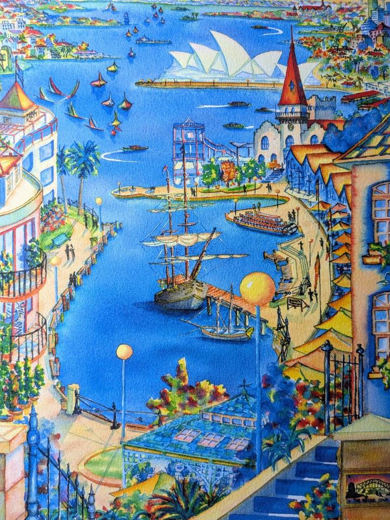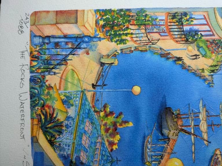 View from the Hickson Street Embankment between the Park Hyatt Hotel and the Metcalfe Bond Stores over Campbells Cove to the Pacific Ocean. The tall ship depicted in the foreground is the famous Bounty Replica which was used in the making of the 1962 movie ”Mutiny on the Bounty” among others. It sank in 2012, caught up in the devastating Hurricane Sandy. The original work was completed in watercolour, the artist’s master medium, on 100% cotton watercolour paper.
