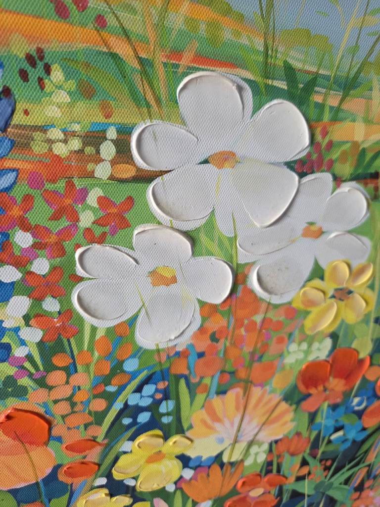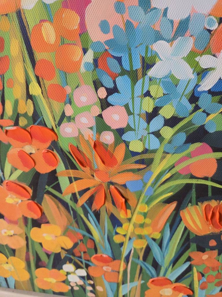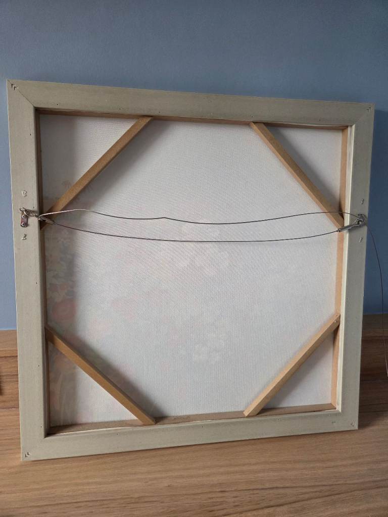 Oil paint on canvas framed picture. Approx 70cm square (including frame) with adjustable hanging wire on the back.
