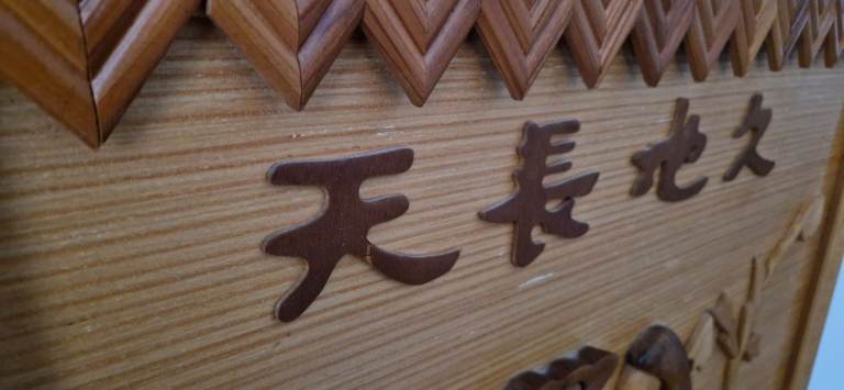 A Chinese plaque made from multi tone carved wood