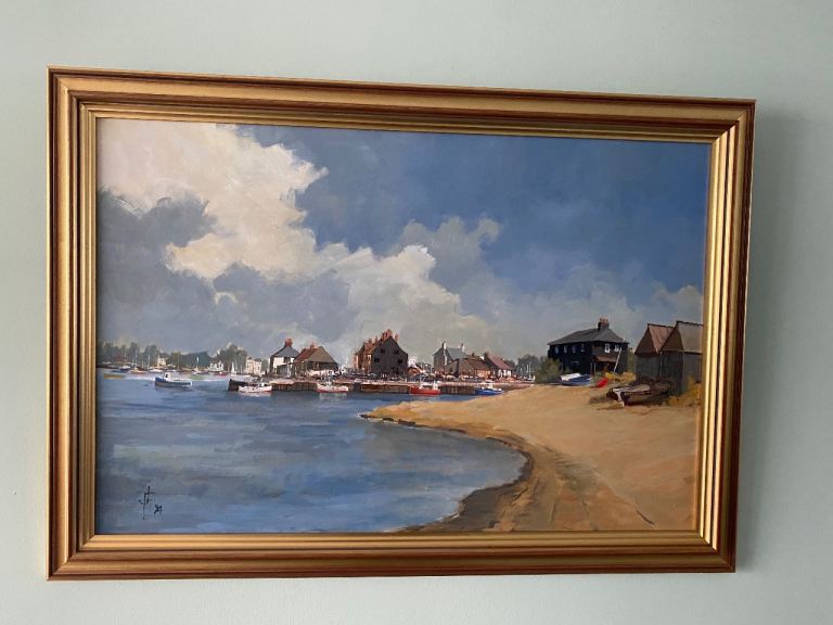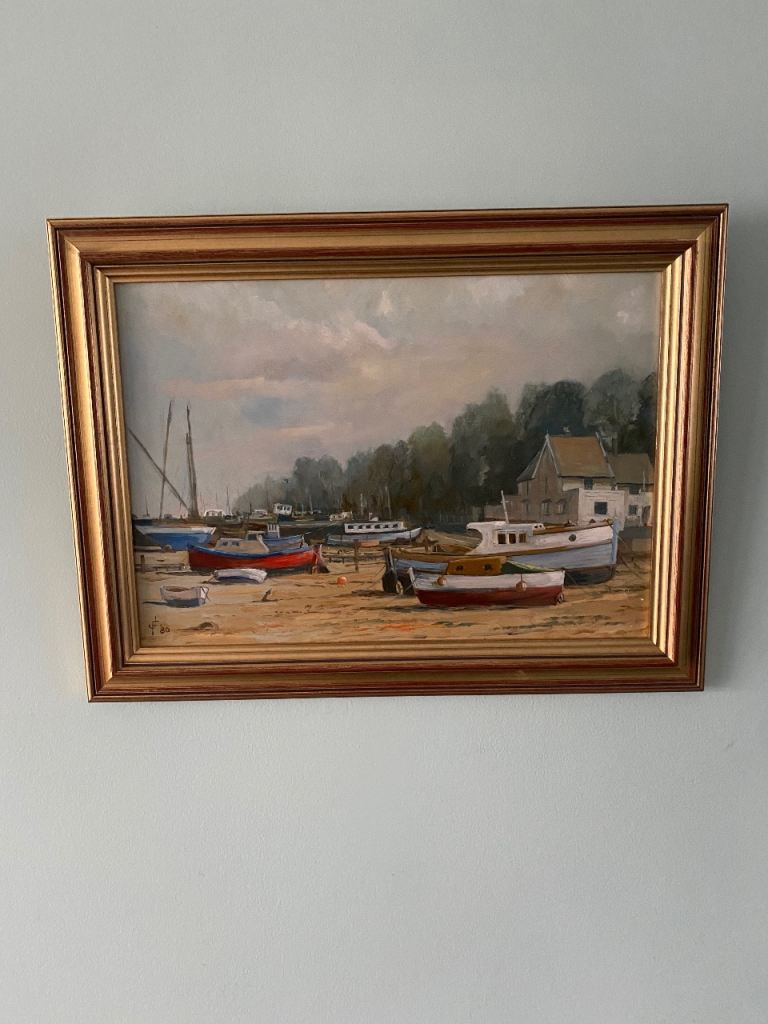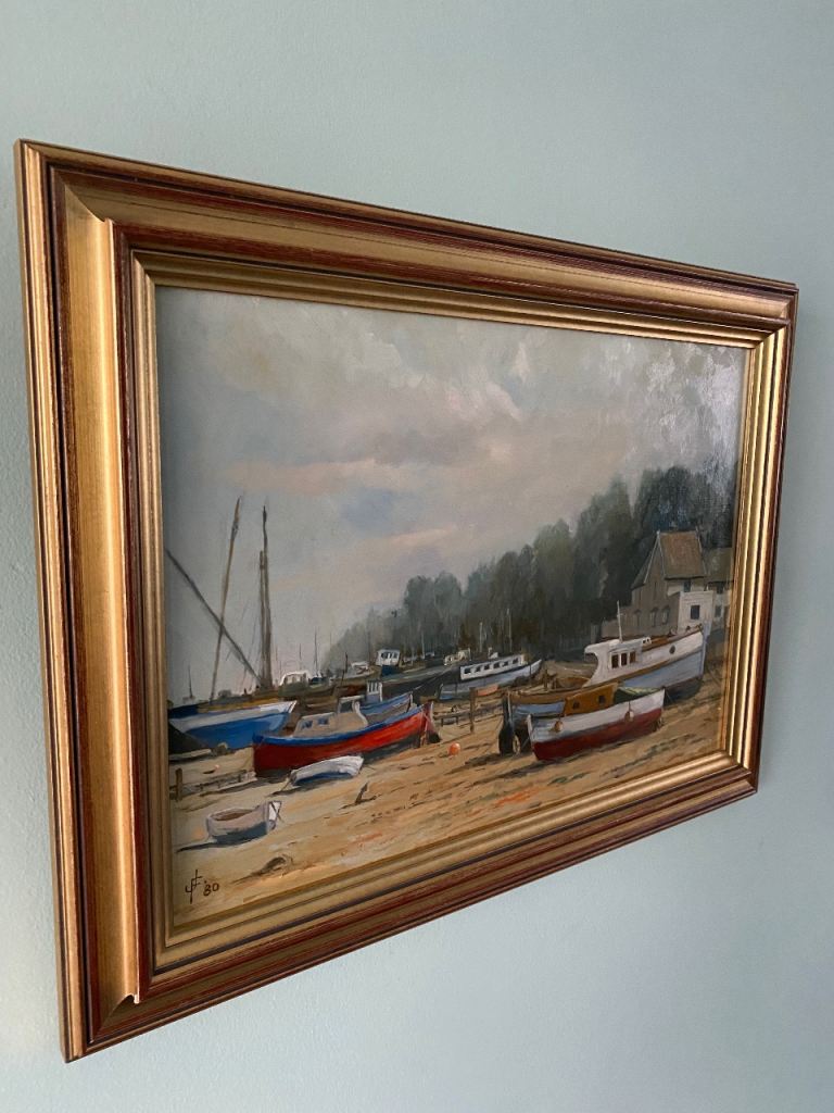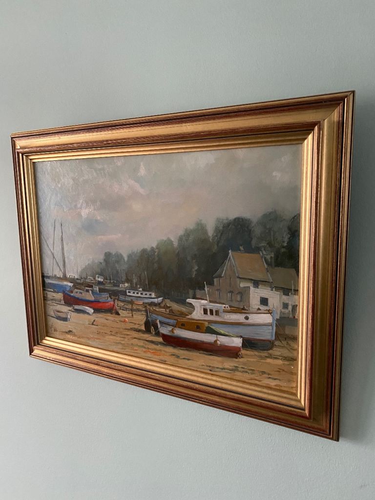 COASTAL / BOATS ORIGINAL PAINTING SIGNED BY ARTIST IN FABULOUS GOLDEN FRAME. PICTURE ART ARTWORK. 19 INCHES WIDE X 14 INCHES HIGH. (ALSO SELLING ANOTHER PAINTING BY THE SAME ARTIST IN A SEPARATE ADVERT - SEE LAST PHOTO). 🔴HAPPY TO POST FOR POSTAGE COST.