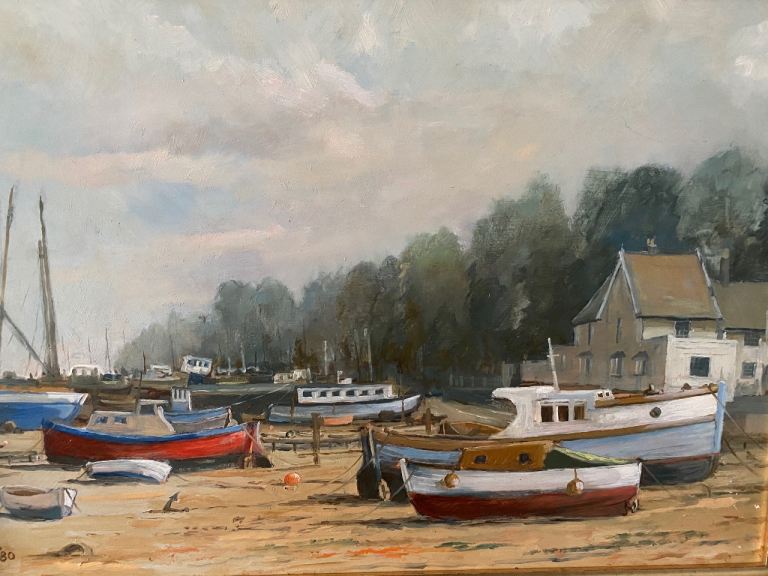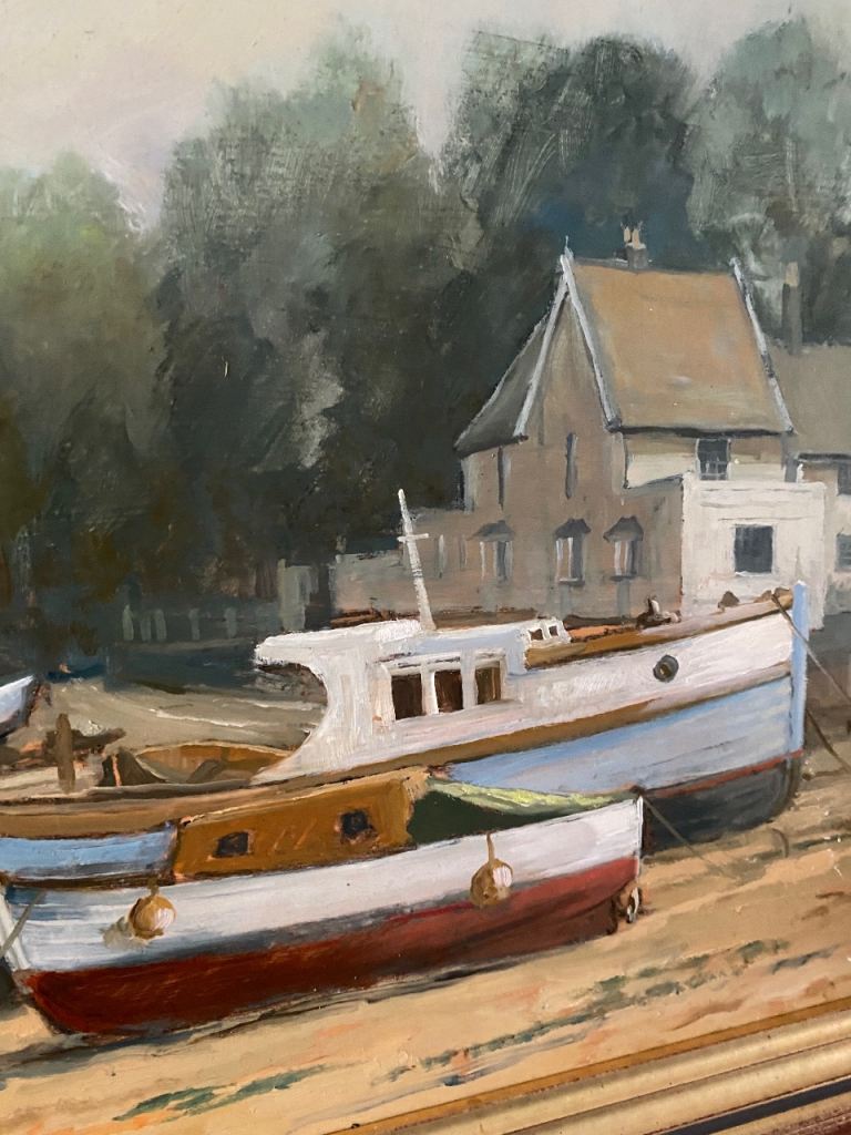 COASTAL / BOATS ORIGINAL SIGNED PAINTING IN GOLDEN FRAME