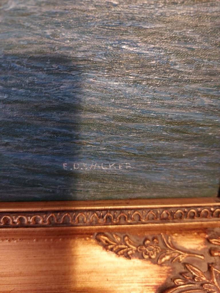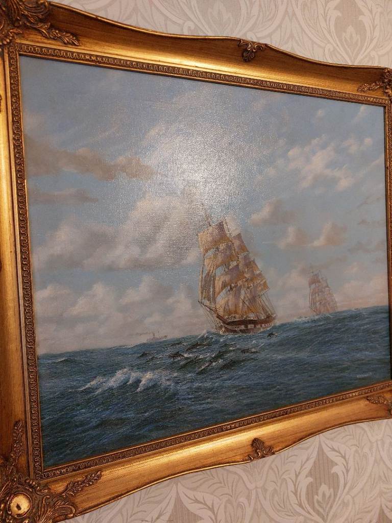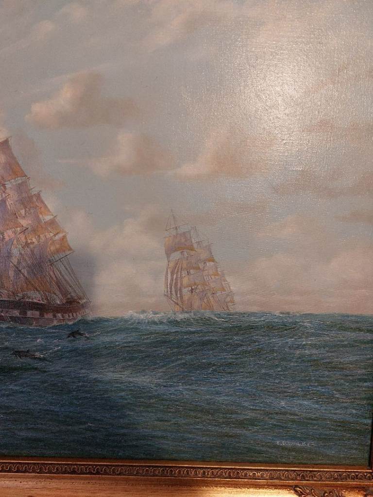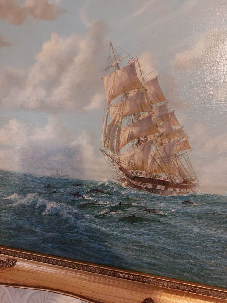 Original E D Walker ship oil painting purchased in 1991 – Nairnshire Amongst the Dolphins.