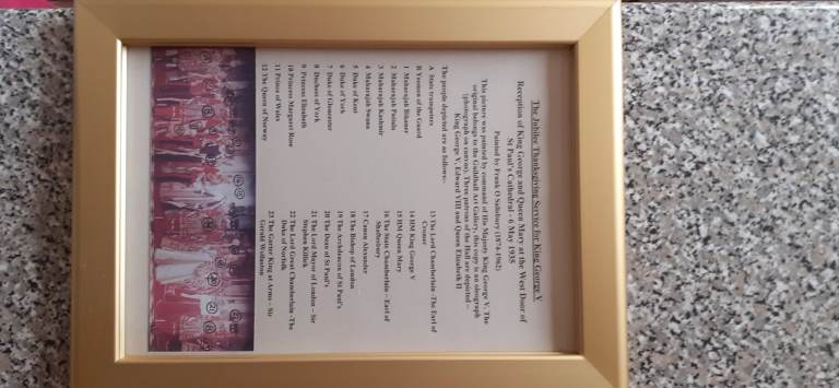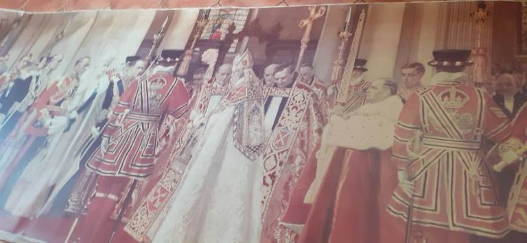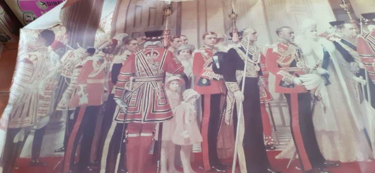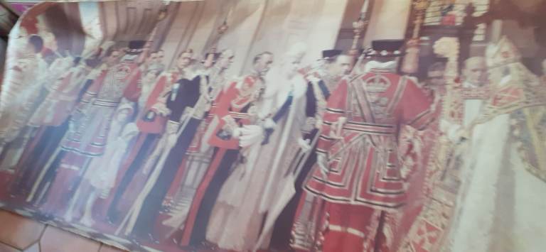 Canvas and photo description of The Jubilee For King George v,this is a copy,measures 4ft by 12ft.princess Elizabeth and Margaret as small children, as well as King George v and Queen Mary.Great for a school or museum. Cash only.