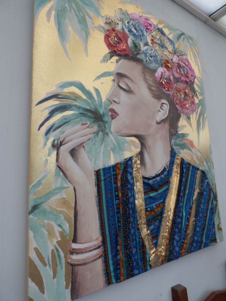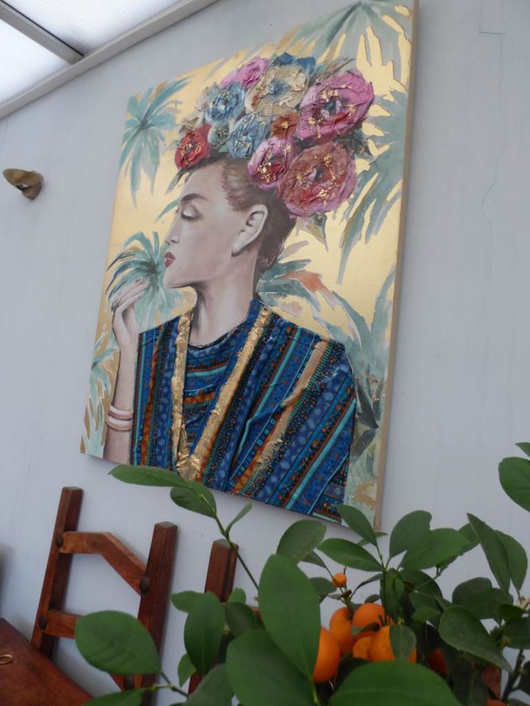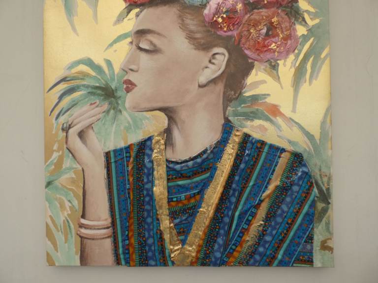 Brighten up your wall with this extra-large flower lady print, a painting on canvas with real fabric.