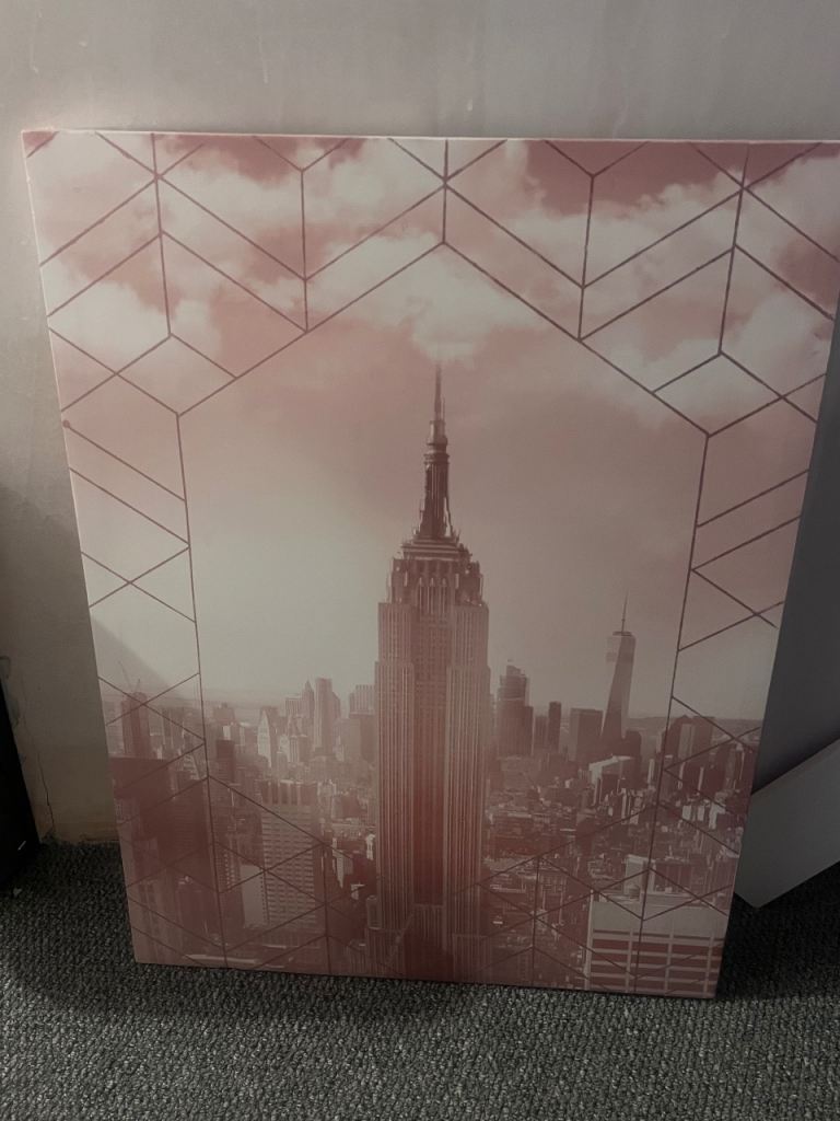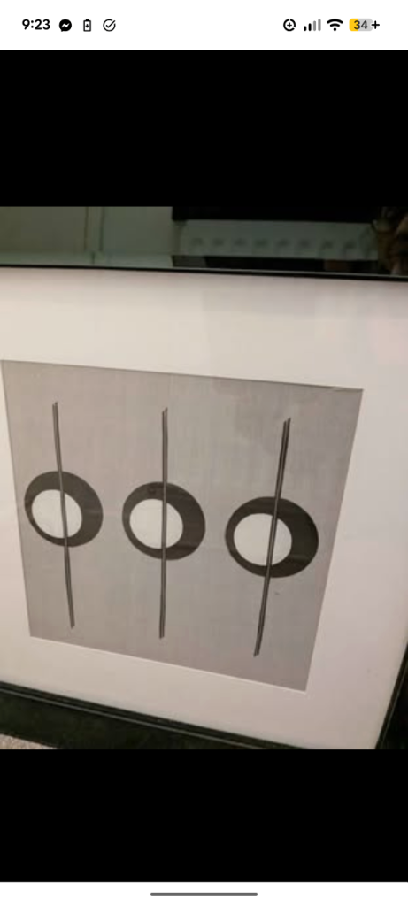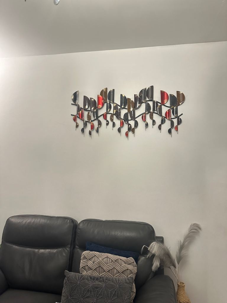 A unique metal wall piece. Colours include black, red, brown, and gold tones. A simple, elegant statement piece.