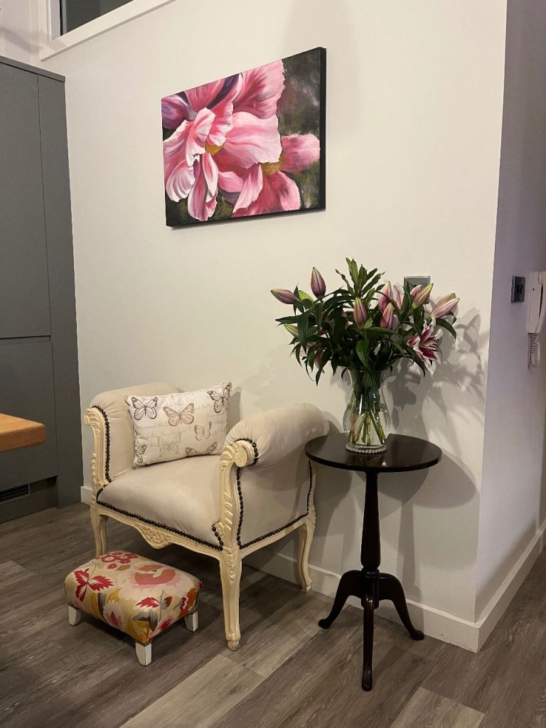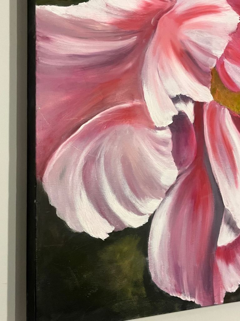 A stunning large canvas original art piece by W Johnson titled “peony flowers”. Signed to the stretcher at the back of the canvas.