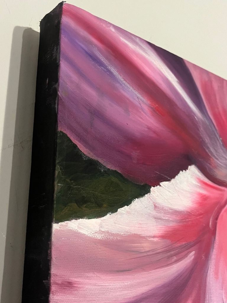 The canvas has been panted black to allowing the fuscia and bubblegum pinks to really pop in this piece.