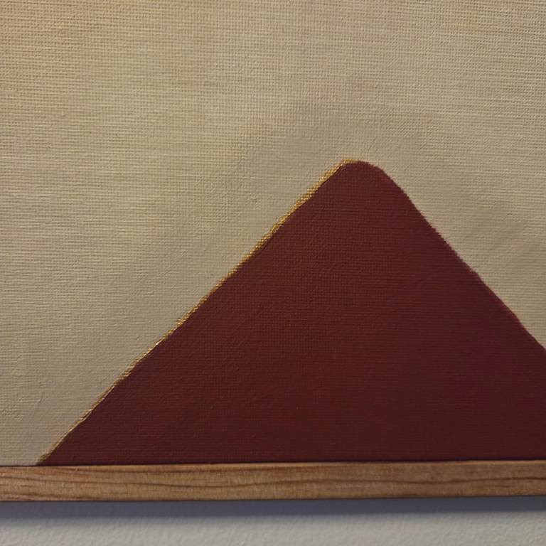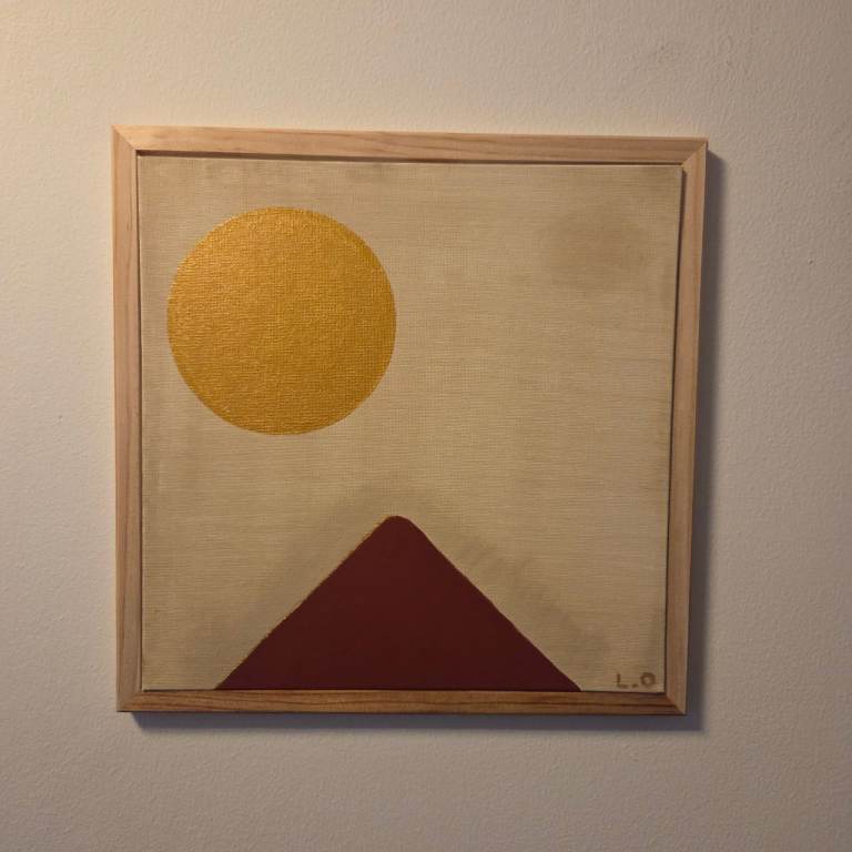 Elevate your space with 'ORO', a unique handmade minimalist study on canvas. Named after the Italian word for 'Gold,' this piece features a striking crimson mountain beneath a heavily textured metallic sun.