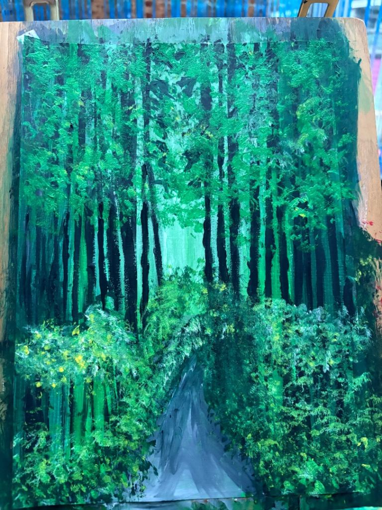 One depicts a tranquil wooded area with a red horizon, and the other shows a charming village on a hillside.