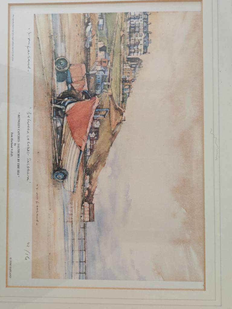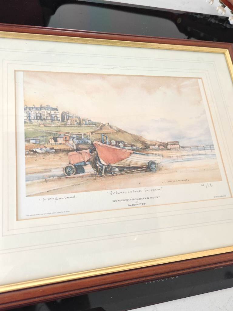 This is a framed art print titled "Between Catches - Saltburn by the Sea" by Tom Harland N.D.D.