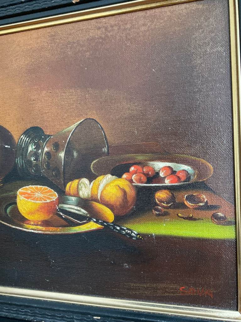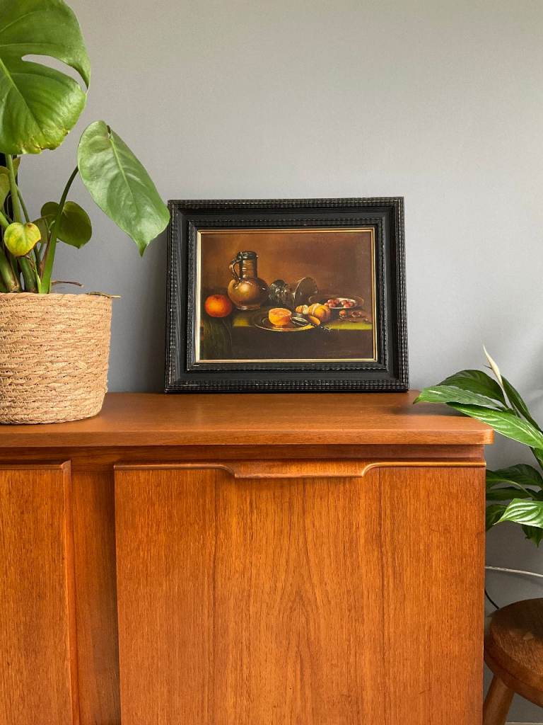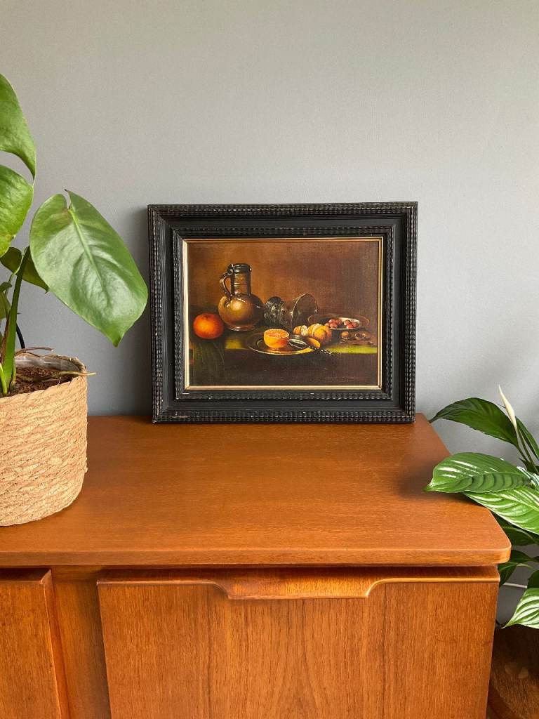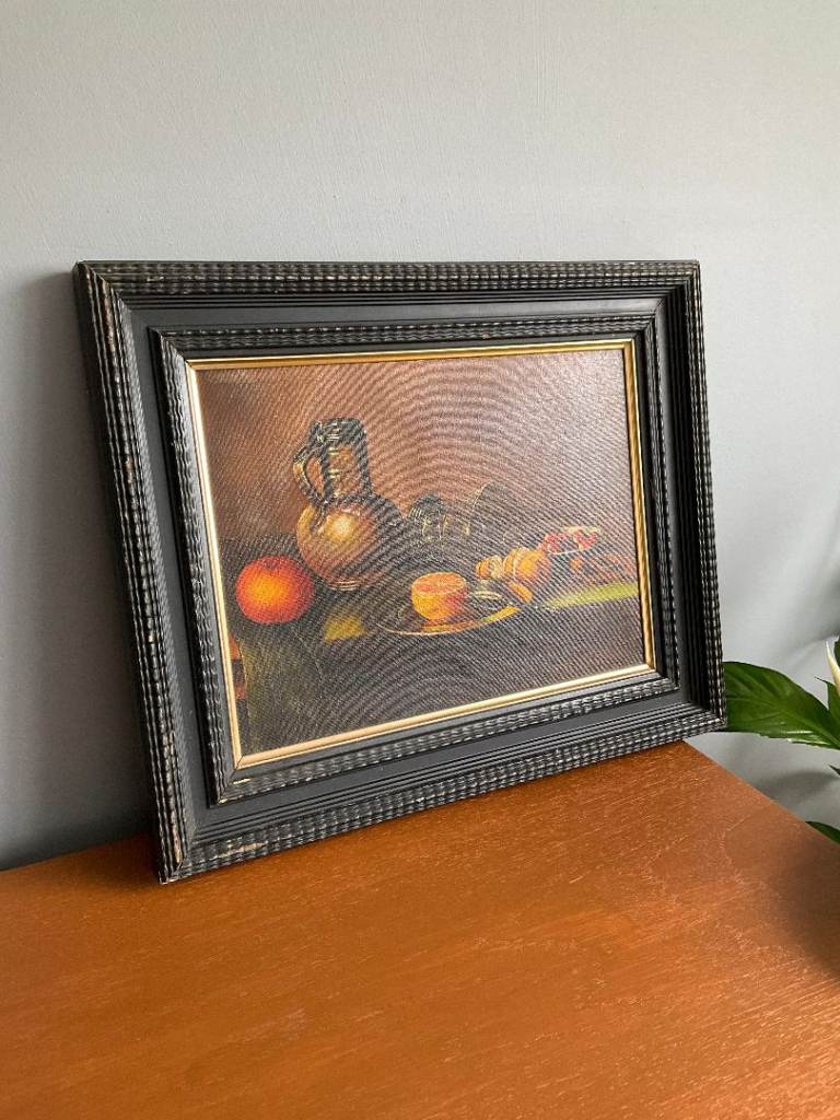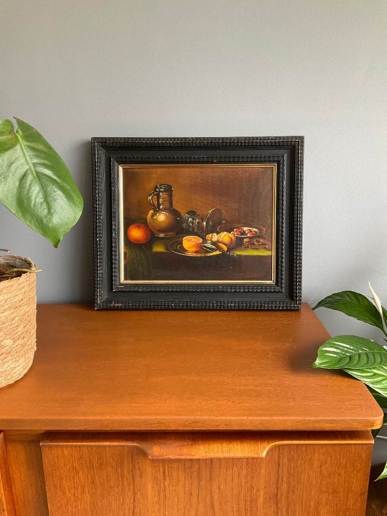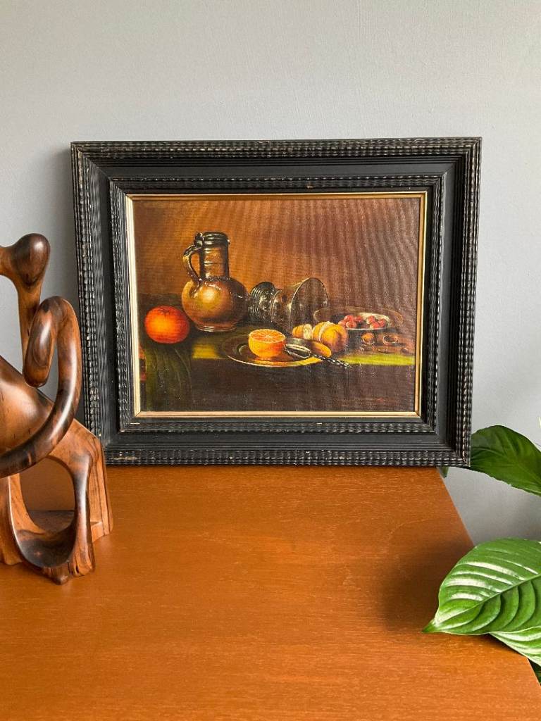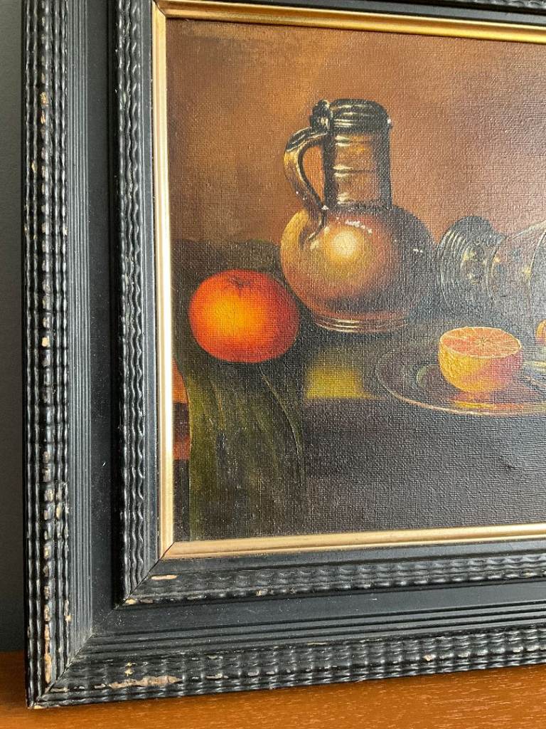 A vintage still life oil painting on canvas, depicting fruit, a ceramic jug and glassware in a traditional composition. The warm tones and classic styling make it a versatile decorative piece.