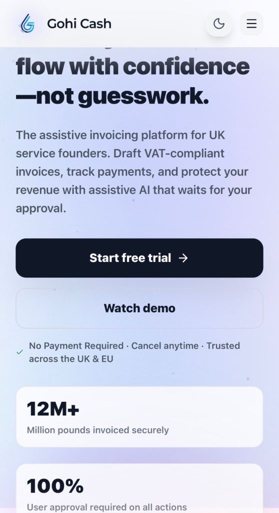 The assistive invoicing platform for UK service founders. Draft VAT-compliant invoices, track payments, and protect your revenue with assistive AI that waits for your approval. Not sure? There is a free trial and if you like it £9pm after. Cancel anytime website Gohi.cash