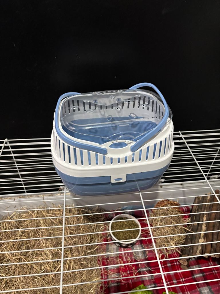 2 Guinea pigs. One white and one coloured. Approx 4 months old. Includes large cage and carry basket