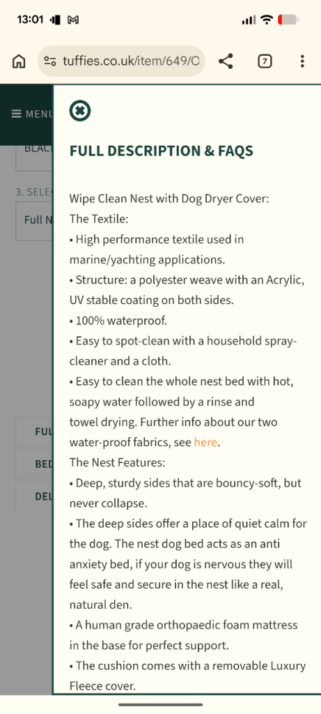 See website for info about these fabulous beds- Tuffies was voted BEST DOG BED 2025 AND 2026 by the readers of YOUR DOG Magazine