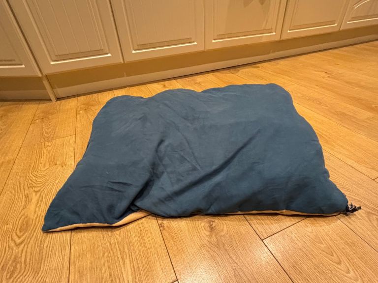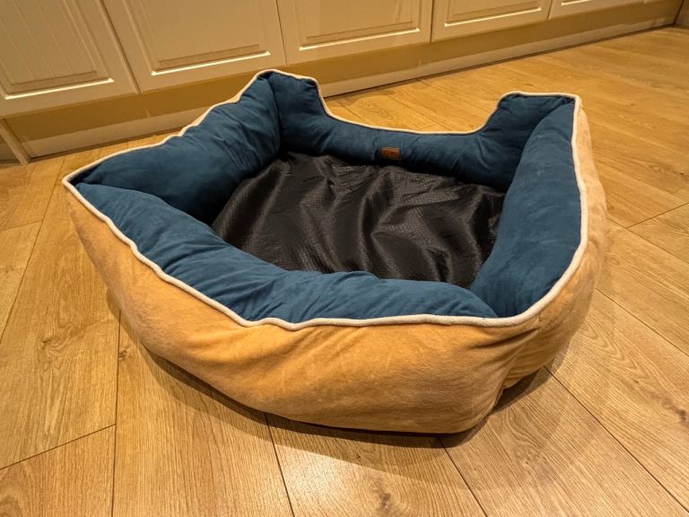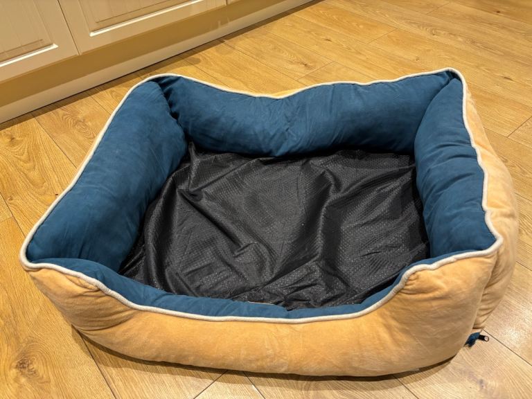 Dog bed with separate cushion in blue and brown. Measures 600x900mm with zip fastening on cushion and outer covers to allow removal for washing. Lined base. Buyer to collect please.