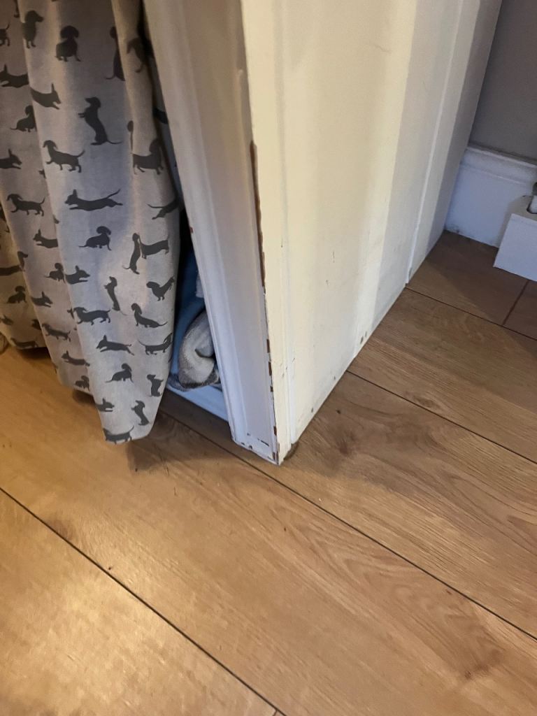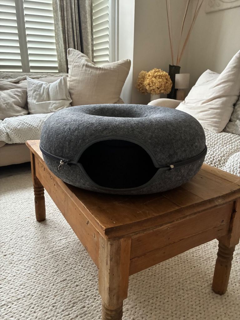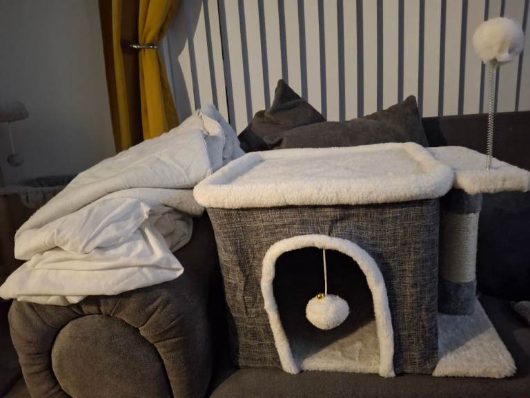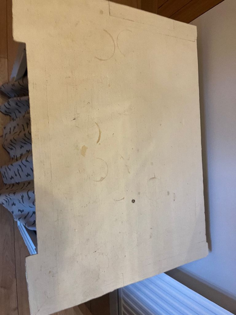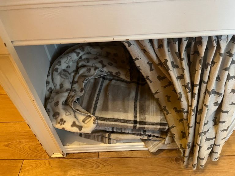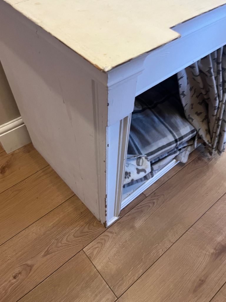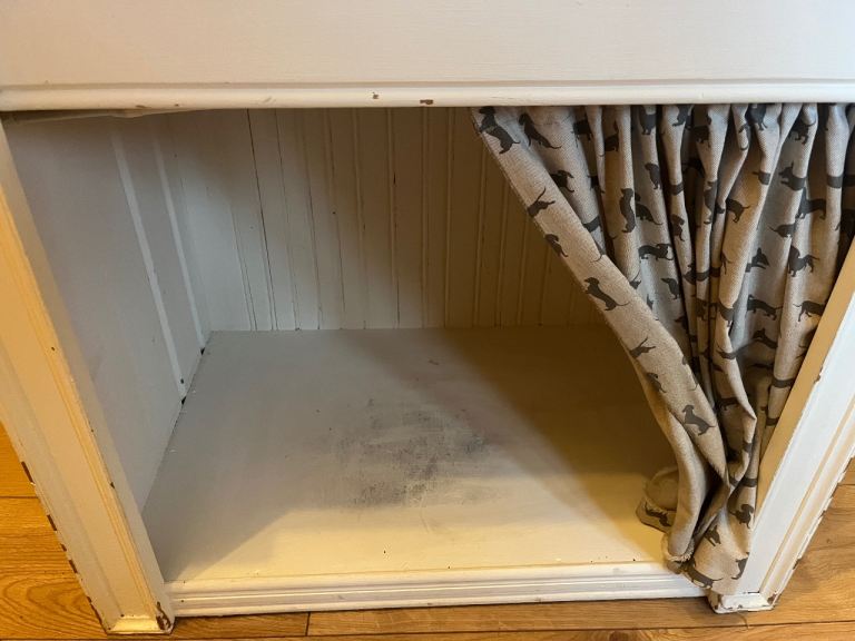 Free - home made dog bed/hall table. It is painted in chalk paint and needs a bit of a rub down and repaint. Has been a well loved bed for our dog which has now been replaced with a slightly smaller unit. We have a small extendable rail inside with curtain hanging - rail not included. We have a sausage dog so would suit smallish dog.