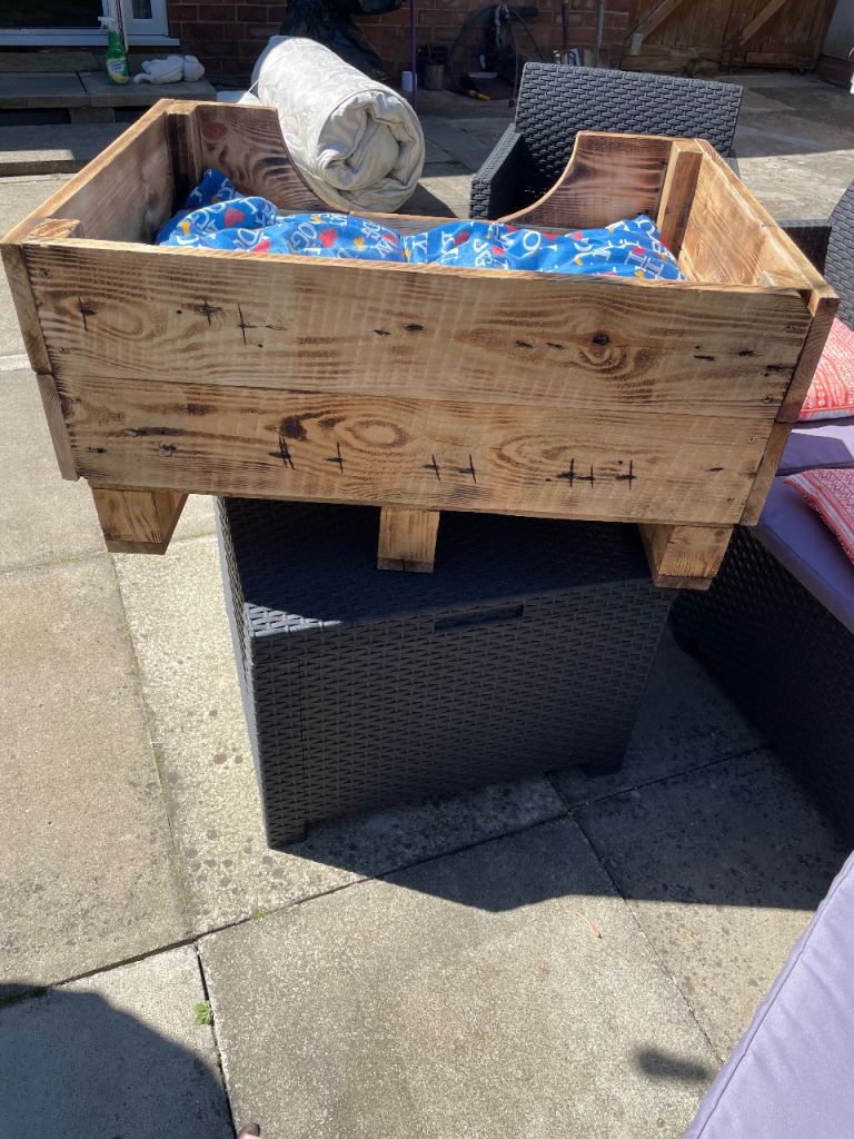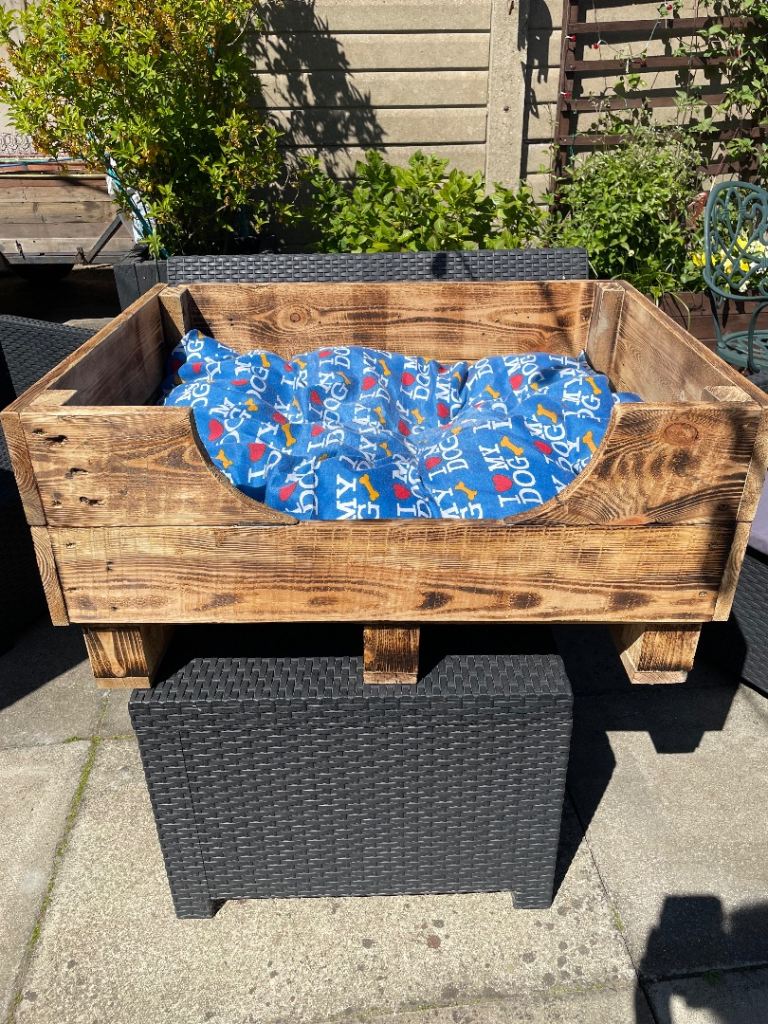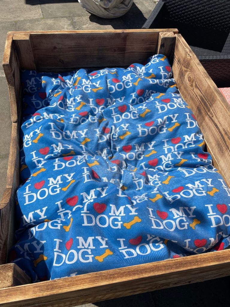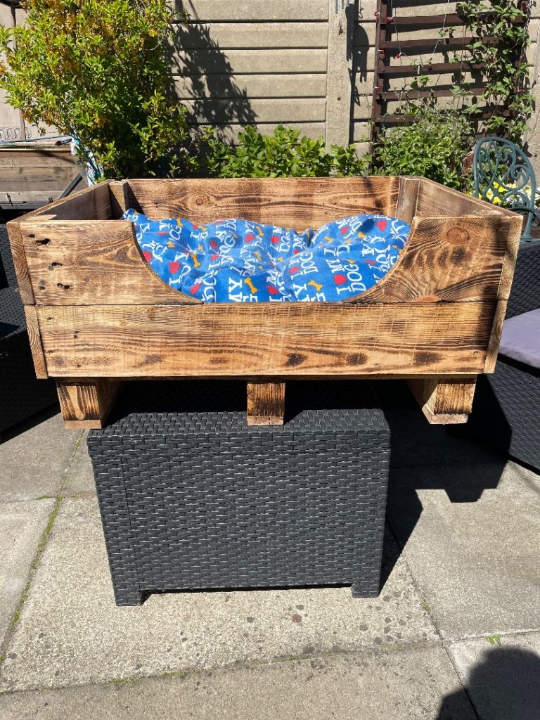 Large new hand made dog bed complete with cushion. Cushion cover unzips for washing please see photos for measurements