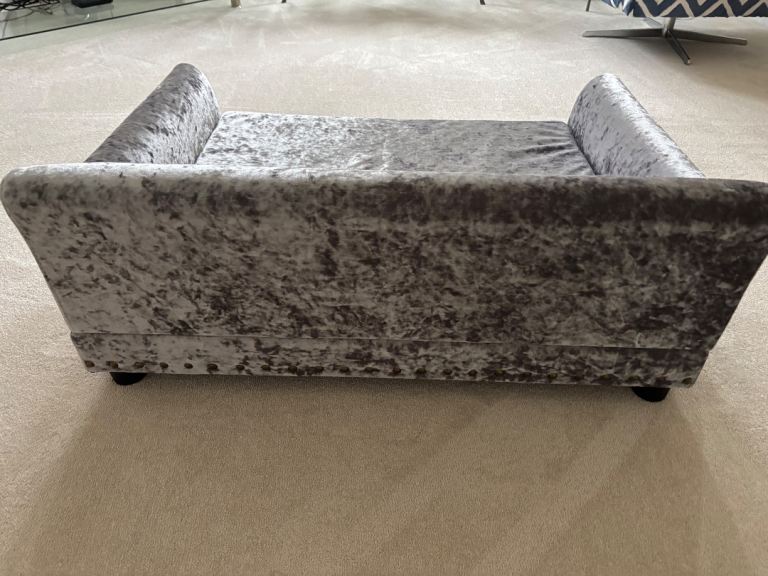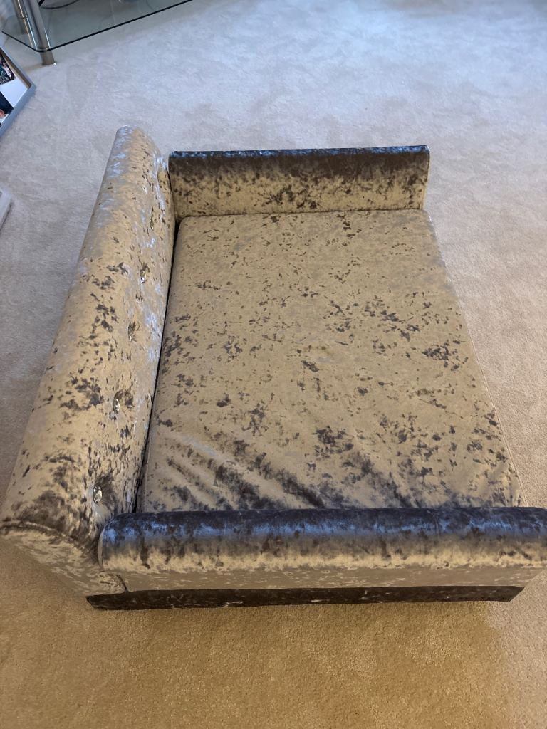Luxury velvet dog sofa with comfy cushion. Wooden frame
