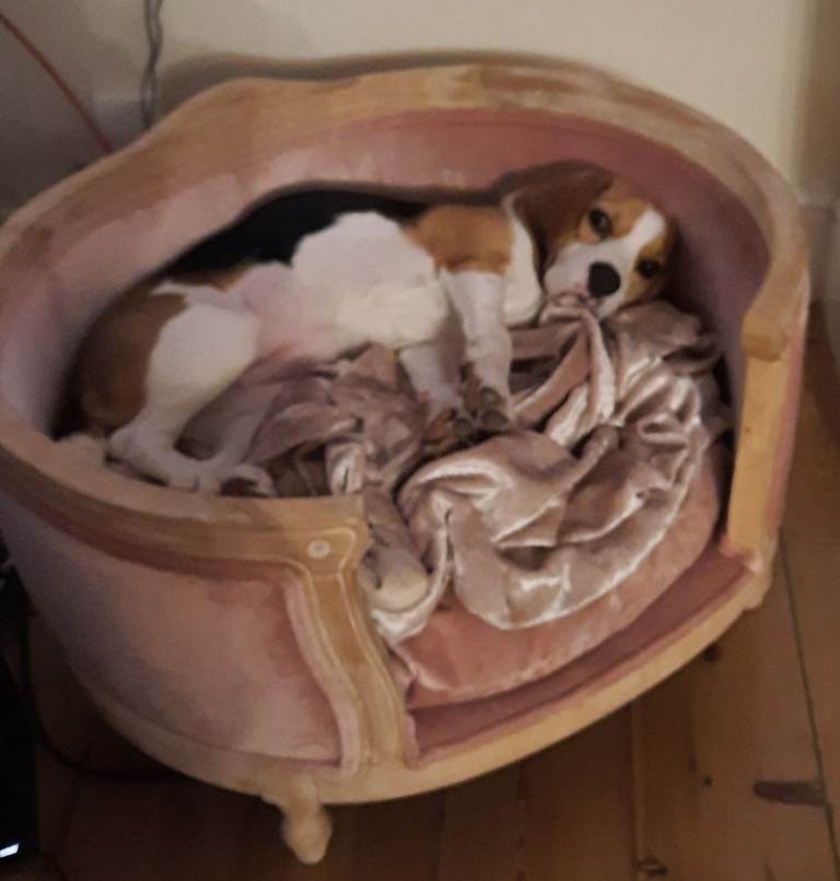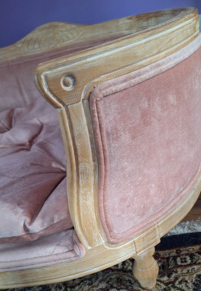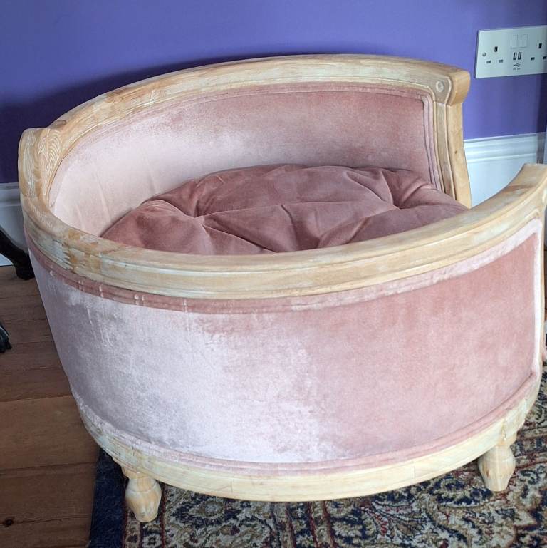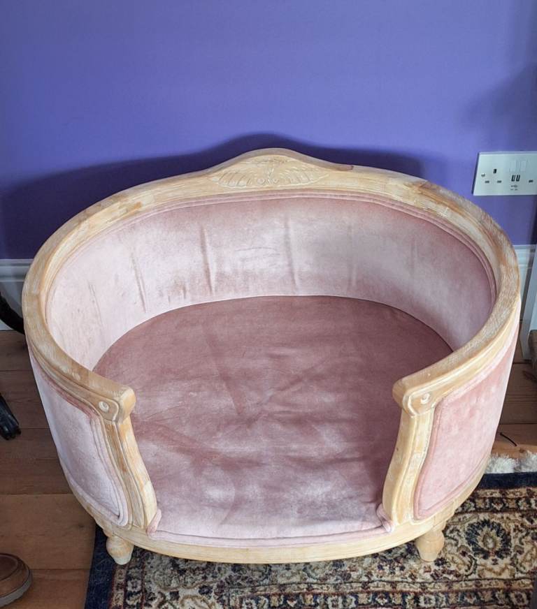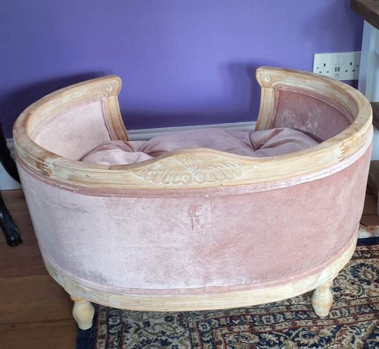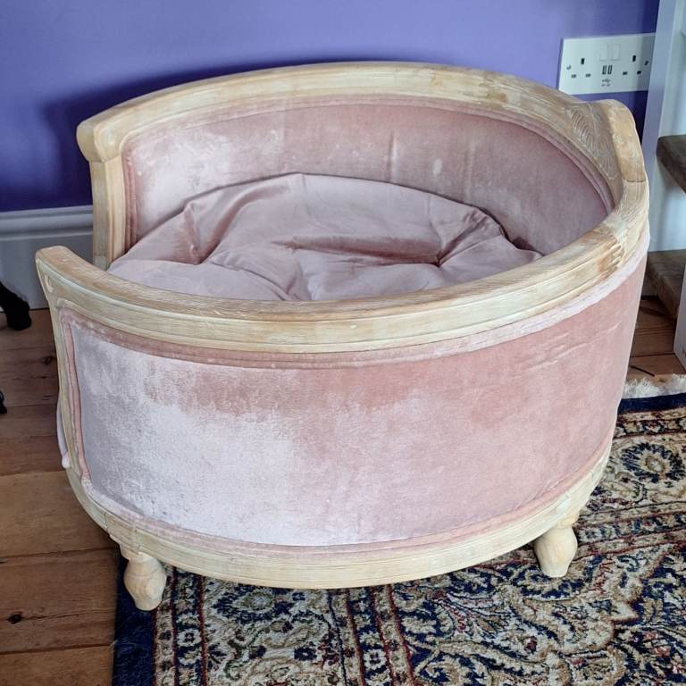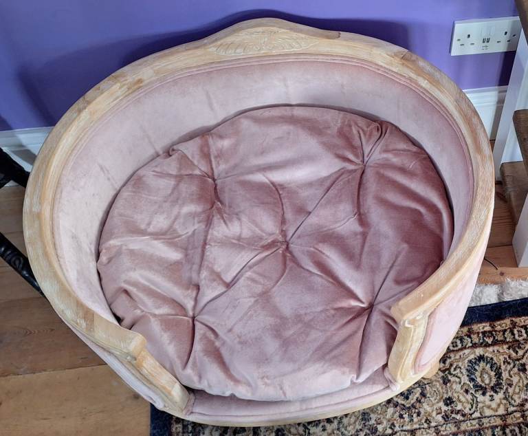 Collection from Hartley, Plymouth, Near Golden Hind pub, PL3 Area. Luxury pet bed. Velvet upholstered and distressed oak. Immaculate condition and measures, Width 78cm, Depth 66cm, Height 43cm. Unable to deliver, but you can arrange your own delivery to anywhere in the UK. Came from from The French Bedroom Company. This pet bed is bigger than what they are currently selling and not in this pleasant pink. Our puppy only sat in it only once and on a pink blanket, but did not sit on the cushion itself, see picture.