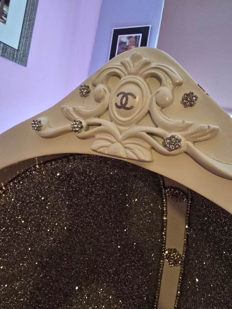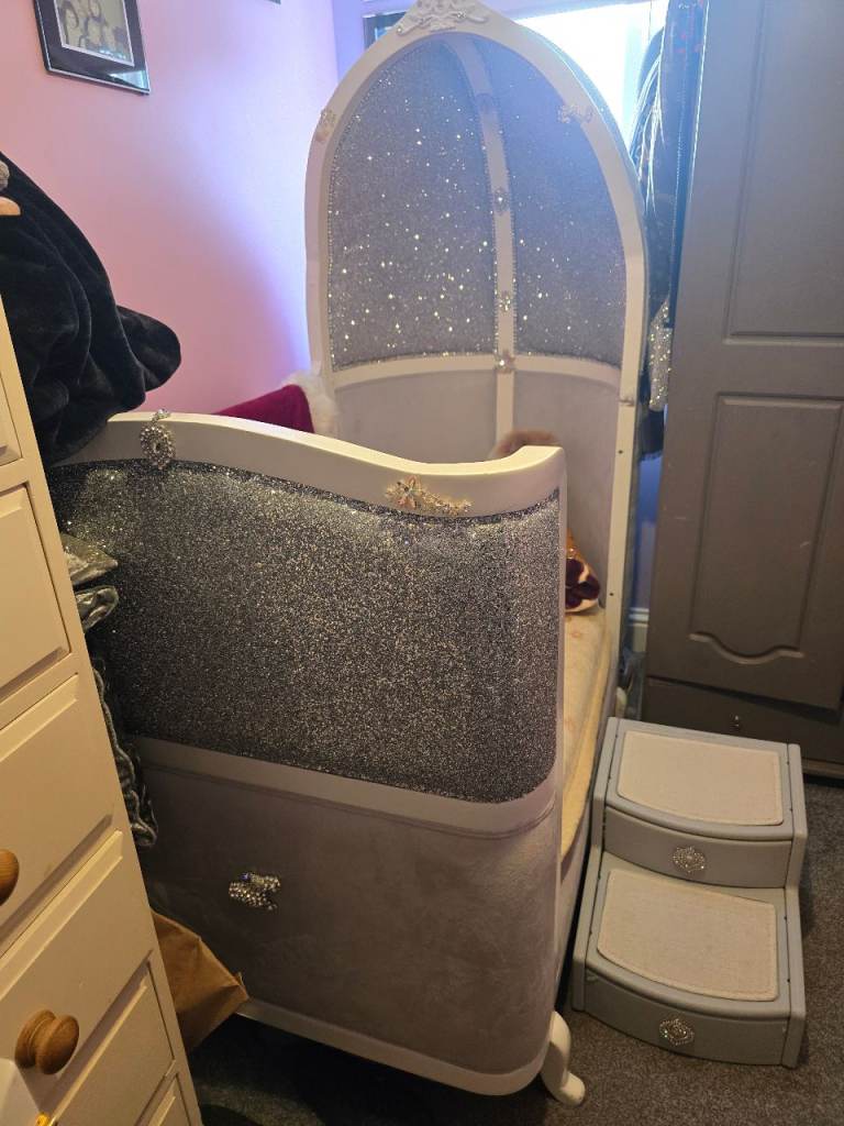 This stunning custom made dog bed is one of a kind. It is definitely a statement piece embellished with rhinestones. Comes with a waterproof mattress and matching steps to help your furbaby get in and out. Moving home forces sale.