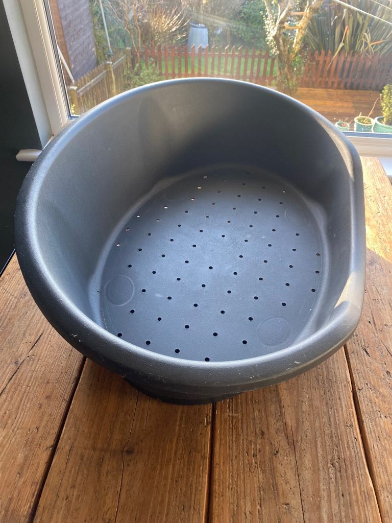 Plastic moulded dog bed base, oval shaped, size is 80cm x 55cm, x 25cm high.