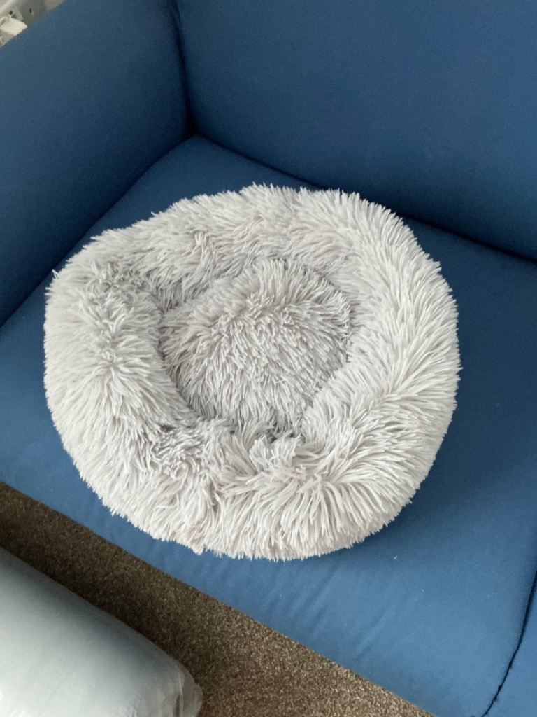 This is Brand New . Measures , INNER 23CMS, DIAMETER 41CMS. Grey, fluffy calming comfort bed.