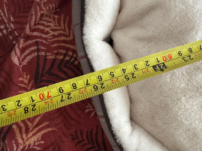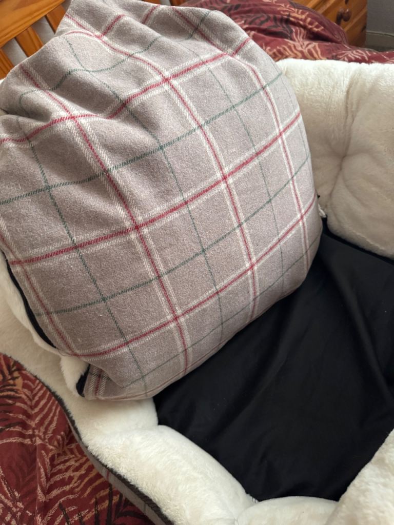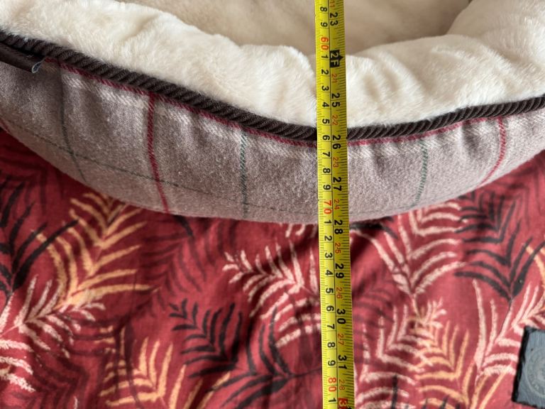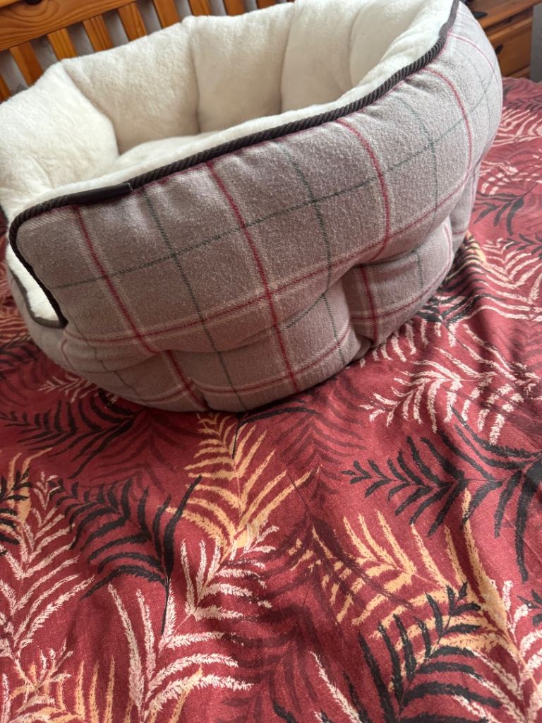 Excellent quality dog bed. Fleece lined. Reversible cushion. Size M/L (size in photos - ideal for up to Staffy size I would say) Bought for our dog but he won’t use so practically brand new never used! Bargain!